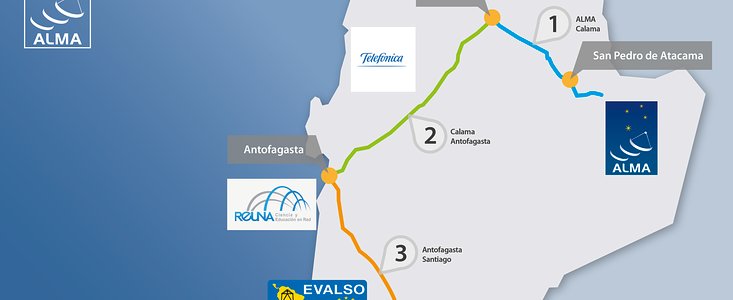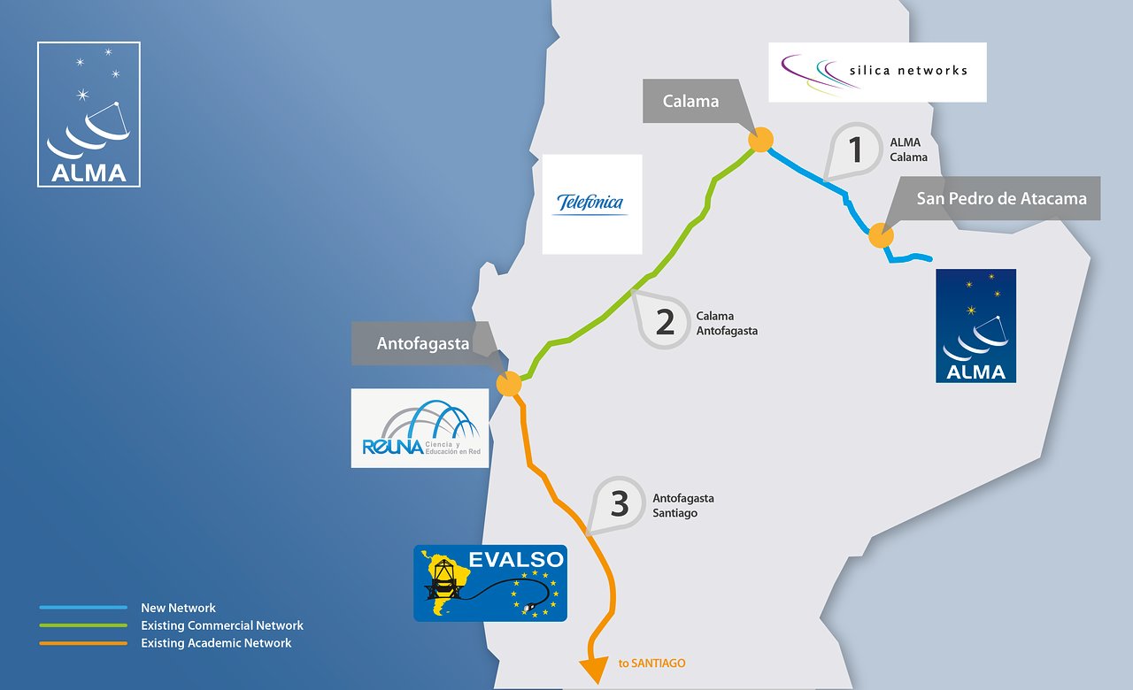 O novo sistema envolve a instalação de aproximadamente 150 quilômetros de cabos de fibra óptica entre o observatório (a 34 quilômetros de San Pedro de Atacama) e a cidade de Calama. De lá os dados irão fluir via uma rede de comunicações existente para a rede acadêmica REUNA em Antofagasta. A conexão de lá para os escritórios do ALMA em Santiago utilizarão a infraestrutura criada em 2010 pela EVALSO, um projeto co-financiado pela Comissão Europeia e operado pelo REUNA que já fornece a conexão entre o observatório no Paranal do ESO, entre outros (ver eso1043 para mais informações sobre o EVALSO). O projeto de fibra óptica é gerenciado por Giorgio Filippi, do ESO, que está atuando também no Observatório ALMA.