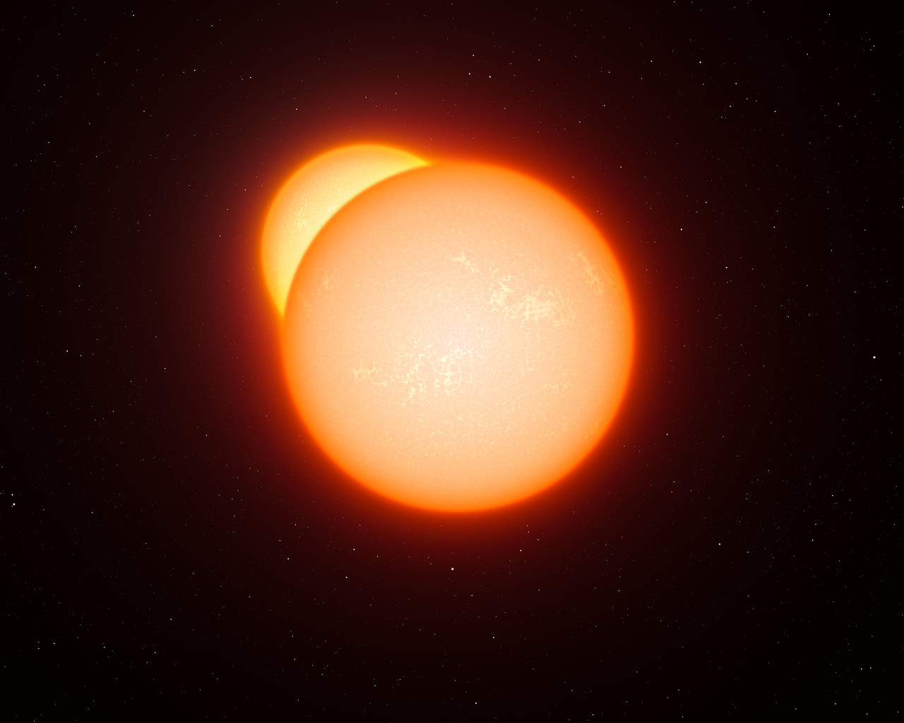 Tato představa ukazuje vzhled zákrytové dvojhvězdy. Při vzájemném oběhu hvězdy přecházejí jedna přes druhou a celková jasnost systému při pozorování z velké vzdálenosti se mění. Studiem světelných změn a dalších vlastností takových systémů mohou astronomové velmi přesně změřit jejich vzdálenost. Dlouhá série pozorování velmi vzácných zákrytových dvojhvězd přinesla dosud nejpřesnější určení vzdálenosti sousední galaxie – Velkého Magellanova oblaku. A to je velmi důležitý krok k přesnému určování vzdáleností v celém vesmíru.
