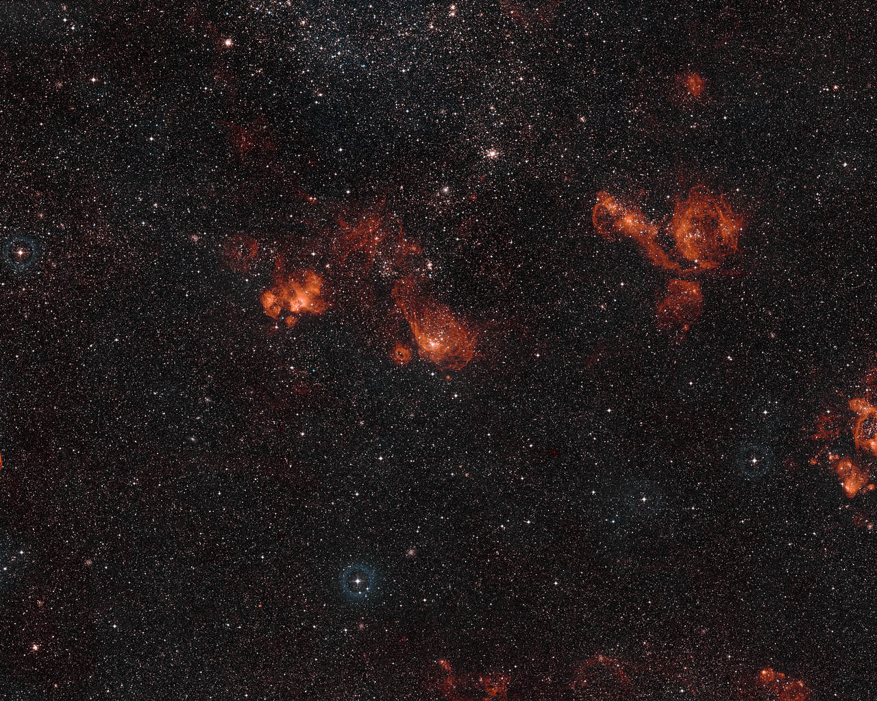 Tento širokoúhlý pohled zachycuje dvojici rozdílných plynných oblaků v souhvězdí Mečouna – NGC 2014 a NGC 2020. V obou případech se jedná o struktury spoluutvářené mohutným hvězdným větrem extrémně horkých mladých hvězd, které plyn zároveň ozařují a nutí jej svítit. Nacházejí se ve Velkém Magellanově oblaku.
