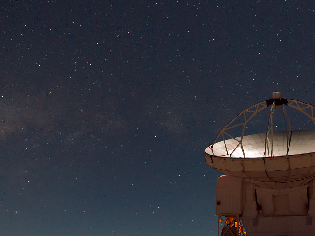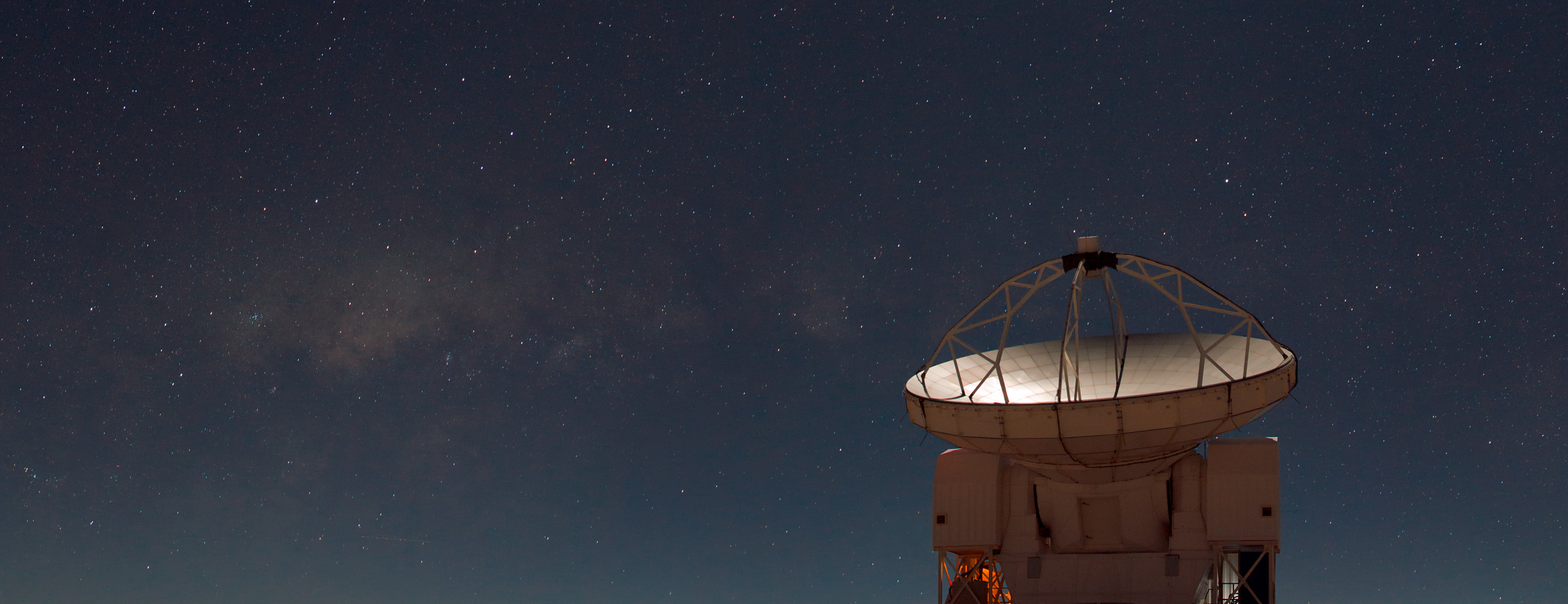 Dette billede viser Atacama Pathfinder Experiment (APEX) på den 5000 meter høje Chajnantor-højslette i de chilenske Andesbjerge. Vores galakse, Mælkevejen, kan ses som et bånd af svage, glødende skyer. Til venstre for APEX ses de centrale dele af Mælkevejen, hvor et supertungt sort hul gemmer sig i midten af vores galakse. APEX er et samarbejde mellem Max-Planck-Institut für Radioastronomie (MPIfR), Onsala Space Observatory (OSO) og ESO. Driften af APEX på Chajnantor varetages af ESO.