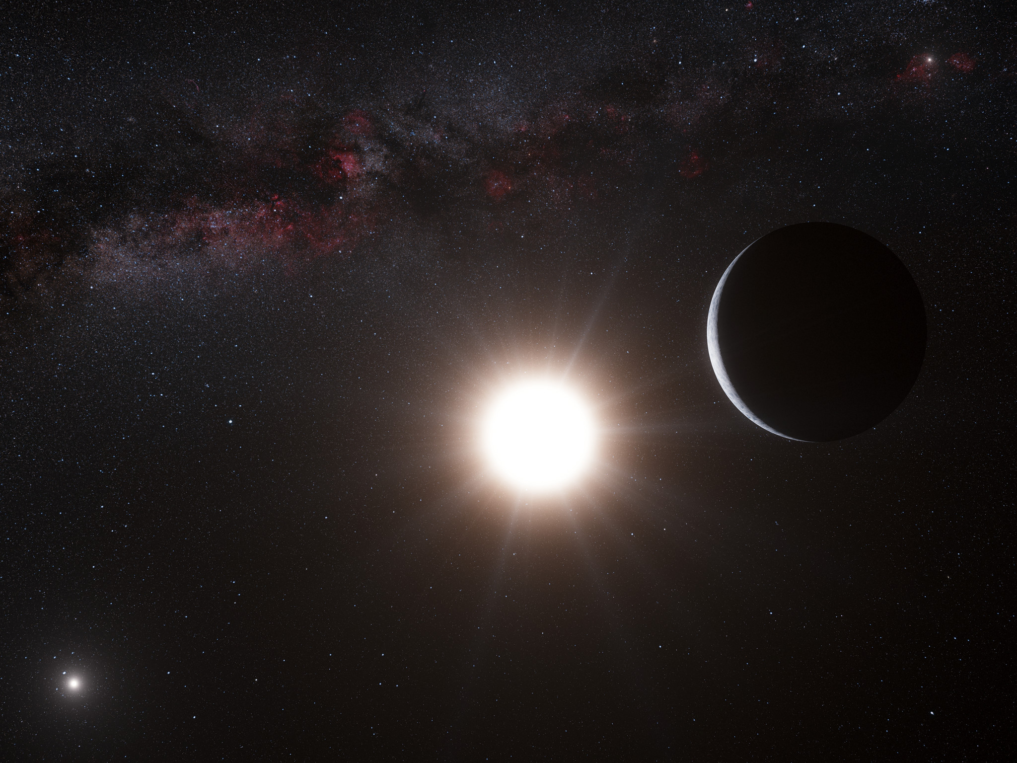 En kunstners forestilling af planeten, der kredser om Alpha Centauri B, et medlem af det tredobbelte stjernesystem, som er nærmest Jorden. Alpha Centauri B er det klareste objekt på himlen, og det andet klare objekt er Alpha Centauri A. Vores egen stjerne, Solen, er synlig øverst til højre. Det lille signal af planeten blev fundet med HARPS-spektrografen på 3,6 meter teleskopet på ESOs La Silla-observatorium i Chile.