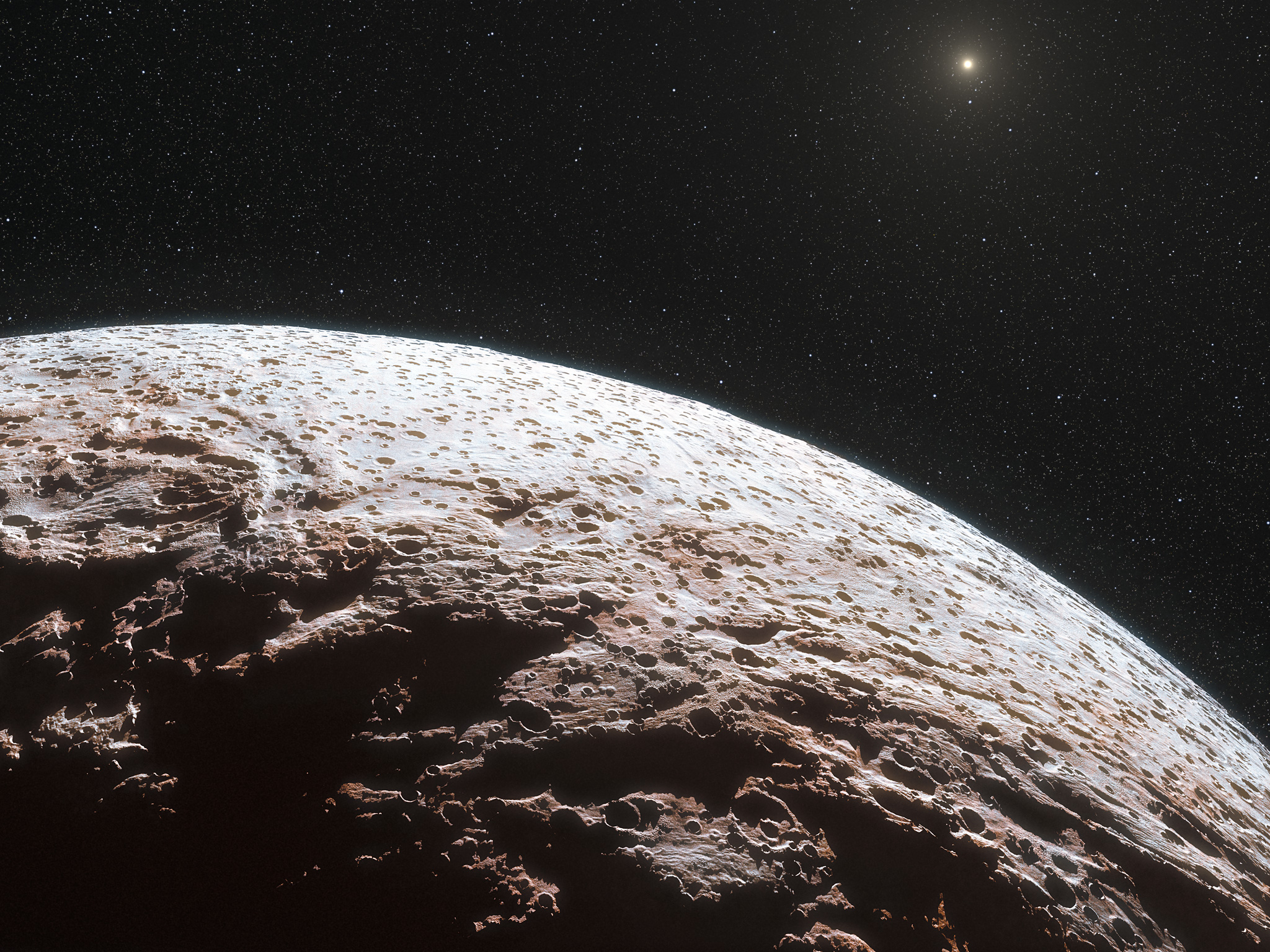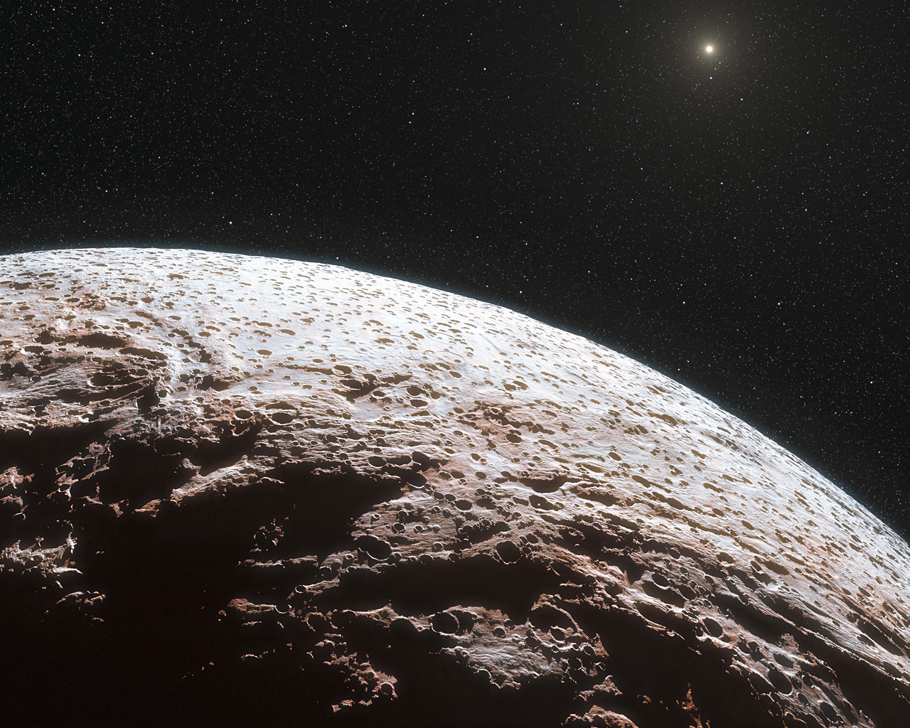 Denne kunstneriske forestilling viser overfladen af dværgplaneten Makemake. Denne dværgplanet har en størrelse på omkring to tredjedele af Plutos og den kredser om Solen i en fjern bane, der ligger længere væk end Plutos, men tættere på Solen end Eris, der er den tungeste dværgplanet i Solsystemet. Det var forventet, at Makemake har en atmosfære ligesom Pluto, men det har nu vist sig ikke at være tilfældet.
