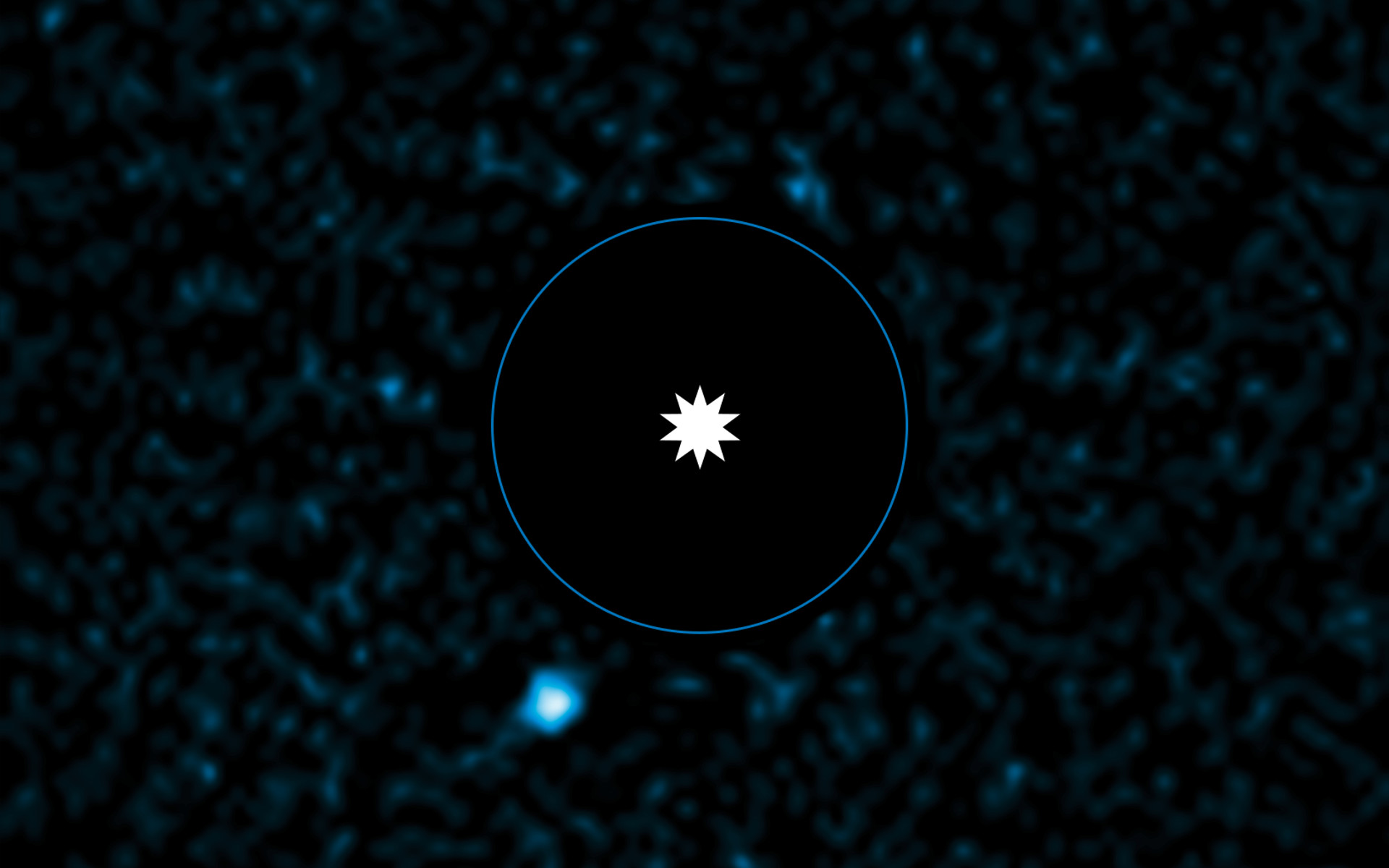Den blåcirkel viser størrelsen af Neptuns kredsløb i solsystemet.
