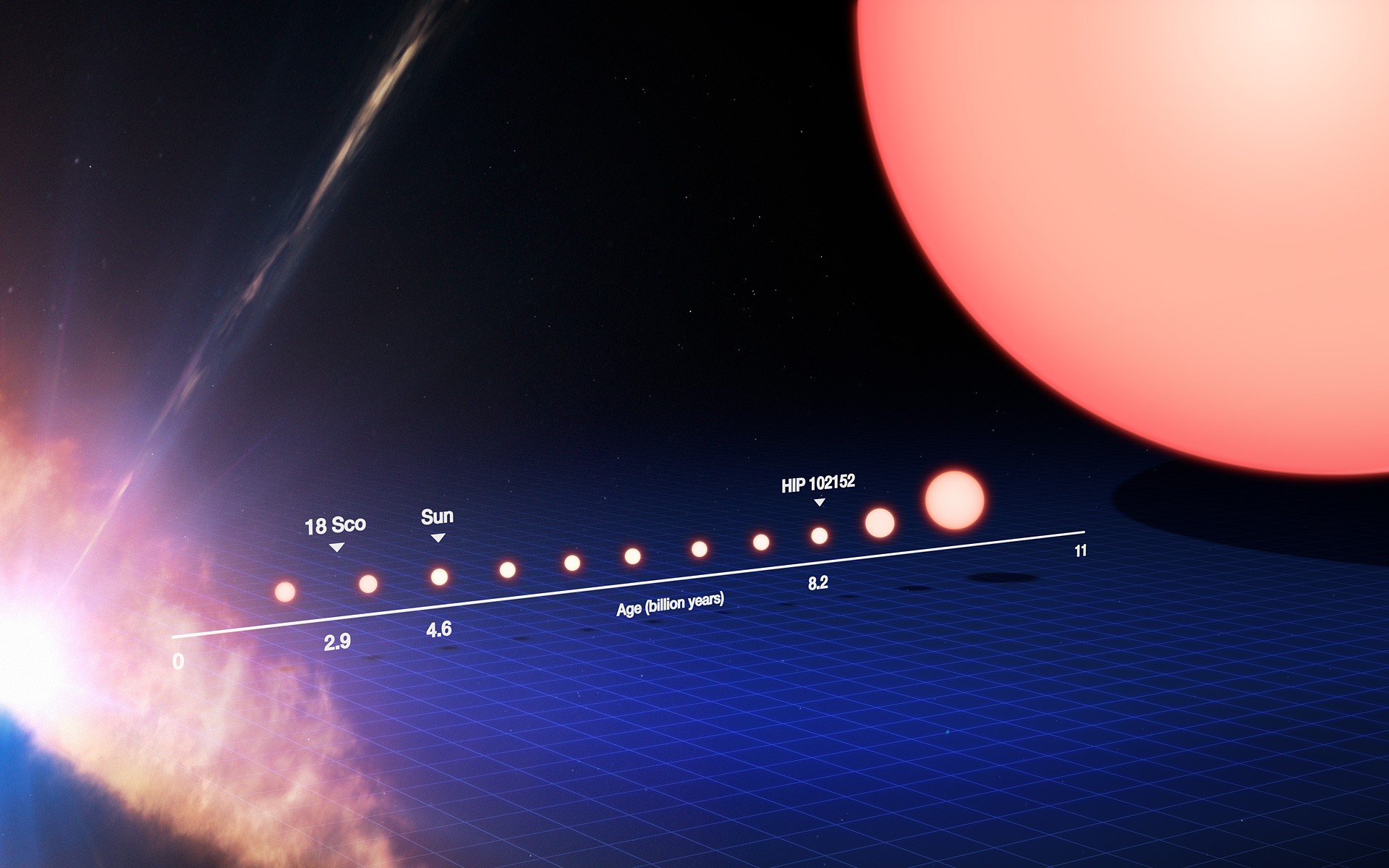 Under tidslinjen er det markeret, hvor Solen og den tvillinger 18 Scorpii og HIP 102152 er i deres livcykler. Solen er 4,6 milliarder år gammel og 18 Scorpii er 2,9 milliarder år, mens den ældste soltvilling er 8,2 milliarder år gammel, og er derved den ældste soltvilling, der er fundet. Ved at studere HIP 102152 kan vi få et glimt af, hvordan Solens fremtid vil se ud.
