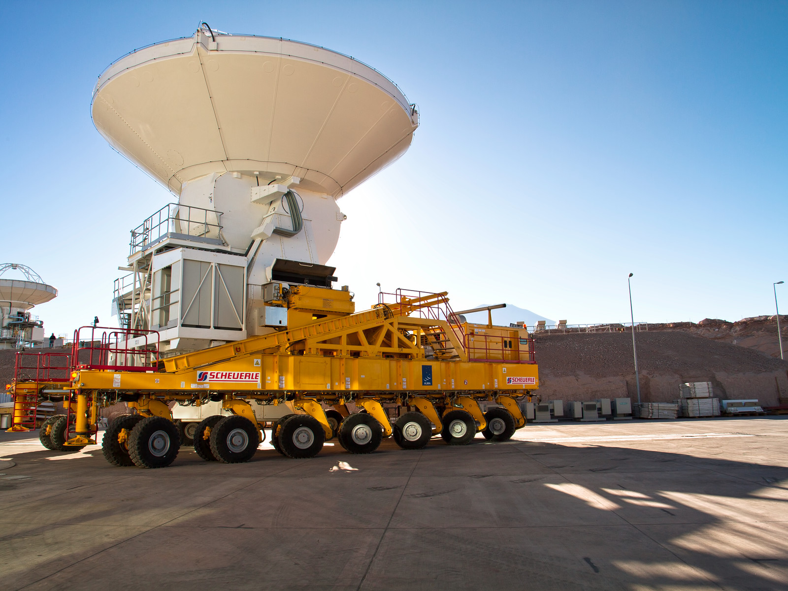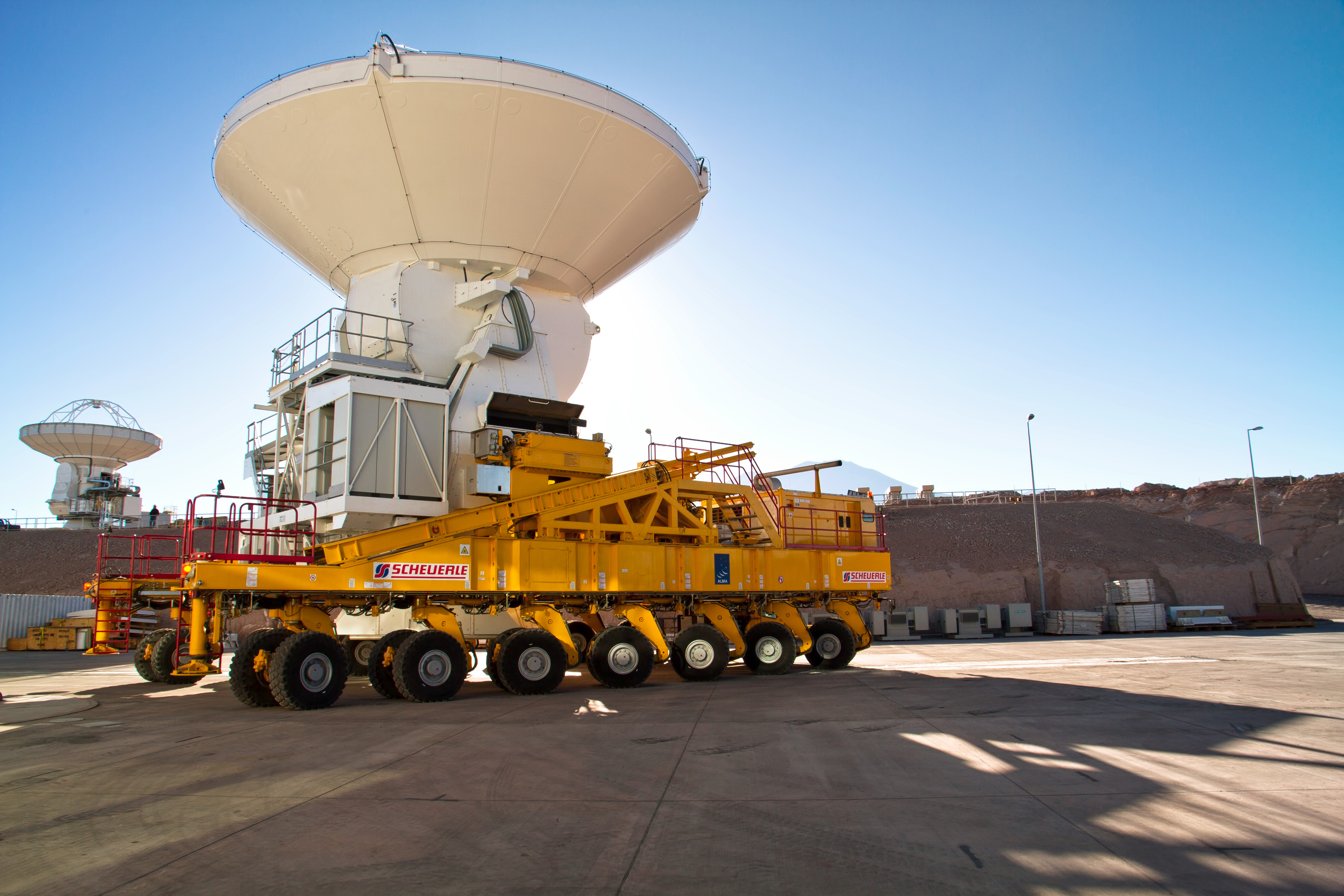 Antennerne, der hver vejer omkring 100 ton, samles og afprøves ved Operations Support Facility, som ligger højt i Chiles Atacama-region ved en højde på 2900 meter. De flyttes herfra til Chajnantor-højsletten 5000 meter over havniveau ved hjælp af to særligt designede ALMA-antenne-transportere – enorme køretøjer, der kører på 28 dæk, er 10 meter brede, 20 meter lange, seks meter høje, vejer 130 ton og har samme kraft som to formel 1-motorer. Den ene af transporterne, der er blevet døbt Otto, er i brug på dette billede, der blev taget, da den første europæiske antenne blev afleveret til observatoriet i april 2011.