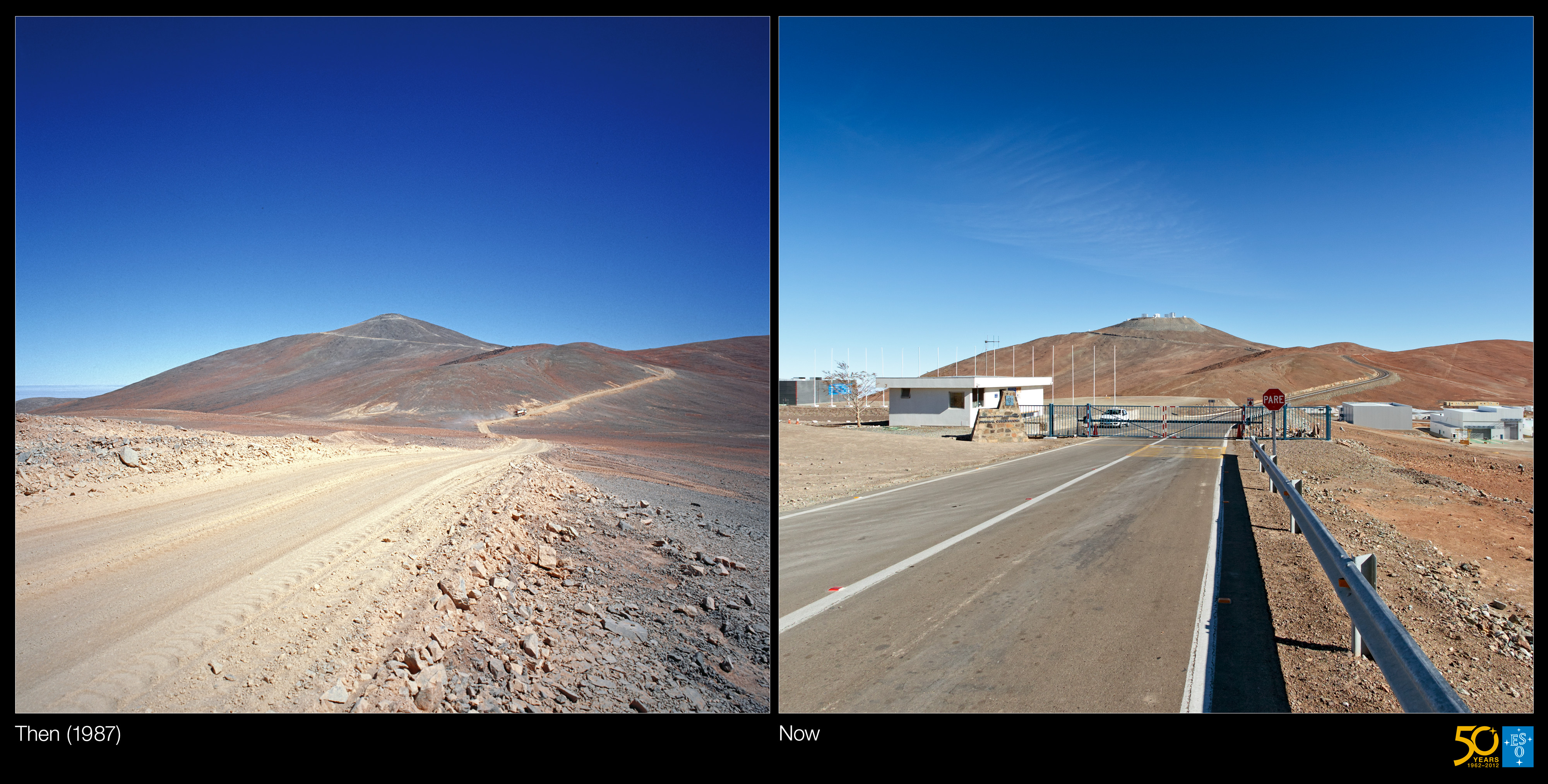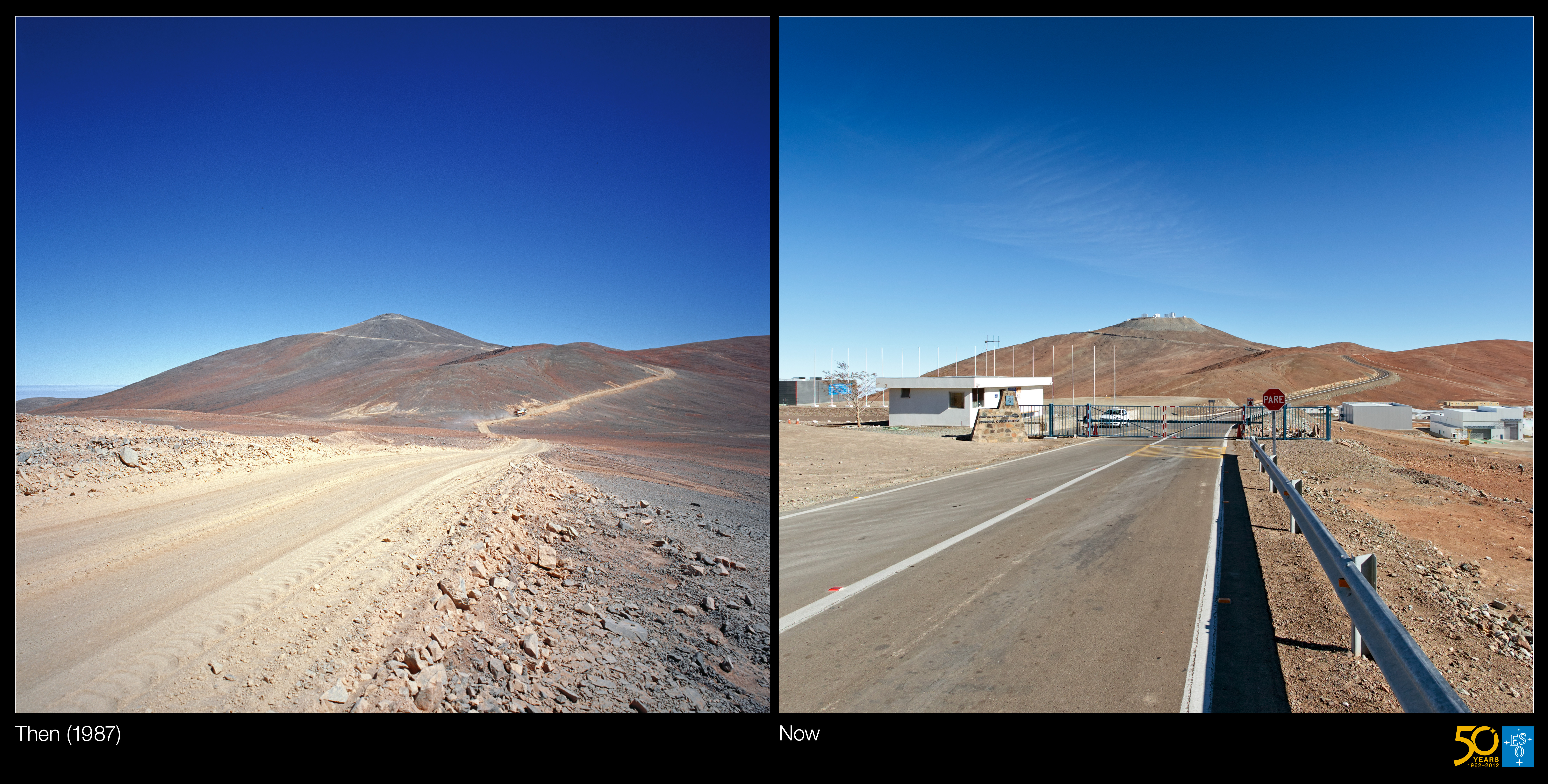 Dette er en side-om-side gengivelse af det historiske og nutidige billede fra før-og-nu ugens billede, Fra en grusvej til verdens førende observatorium.