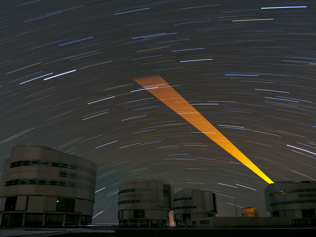 En kraftig laserstråle fra ESOs Very Large Telescope (VLT) stryger over nattehimlen i den chilenske Atacama-ørken på dette fantastiske billede taget af Julien Girard. Jordens rotation under den 30 minutter lange eksponering – og laserens bevægelse som kompensation for dette – er skyld i, at det ser ud som om strålen spreder sig ud. Det er også grunden til, at stjernerne er strakt ud til krumme spor, der afslører subtile forskelle i deres farver.