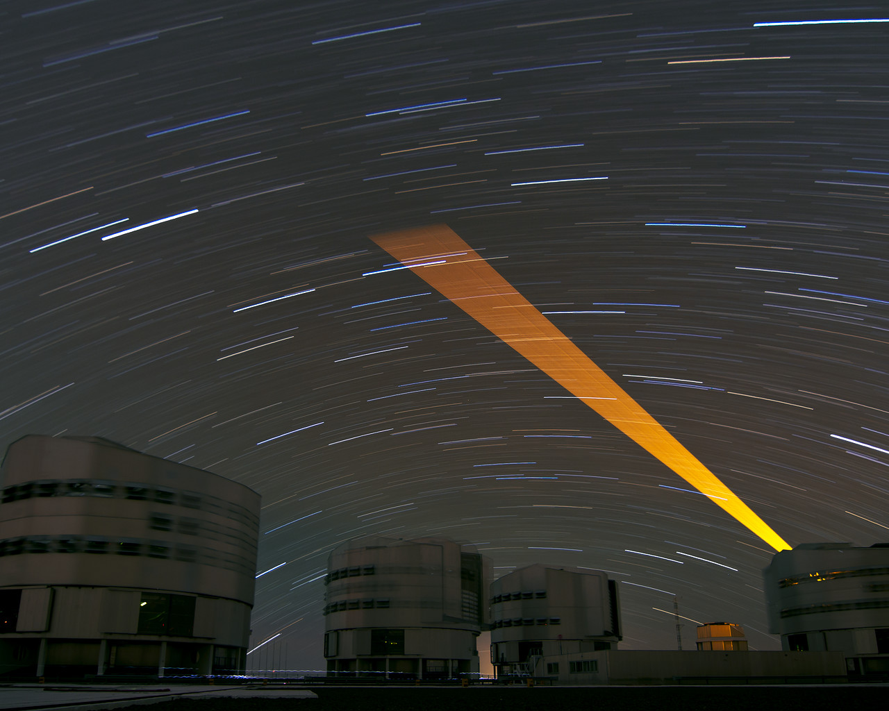 Teleskopbygningernes bevægelser under den lange eksponering ses også som et slør, mens svage spor af lys, lavet af folk, der går henover platformen mellem teleskoperne, også kan ses.