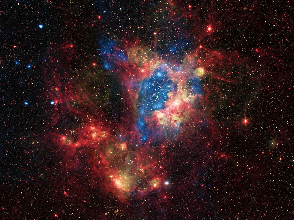 Observationer med NASAs Chandra-røntgenobservatorium (her vist med blå farver) afslører varme områder skabt af disse vinde og chokbølger, mens infrarøde data fra NASAs Spitzer-rumteleskop (vist med røde farver) viser, hvor der findes støv og koldere gas. Billedet i synligt lys fra MPG/ESO 2,2 meter-teleskopet (i gule farver) fuldender billedet og viser de varme unge stjerner samt de glødende skyer af gas og støv, der omgiver dem.