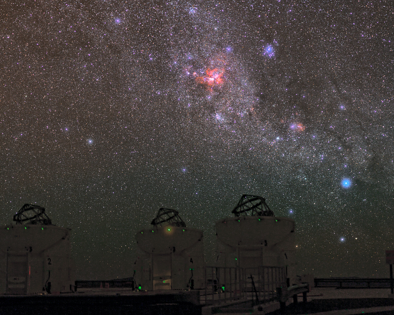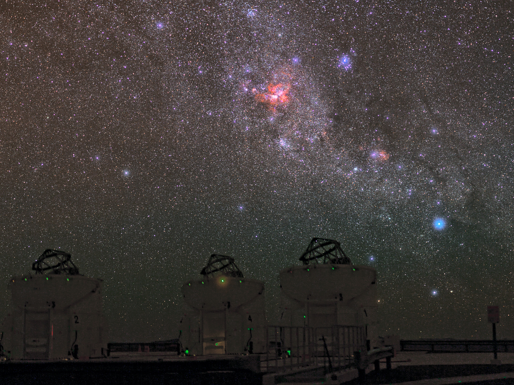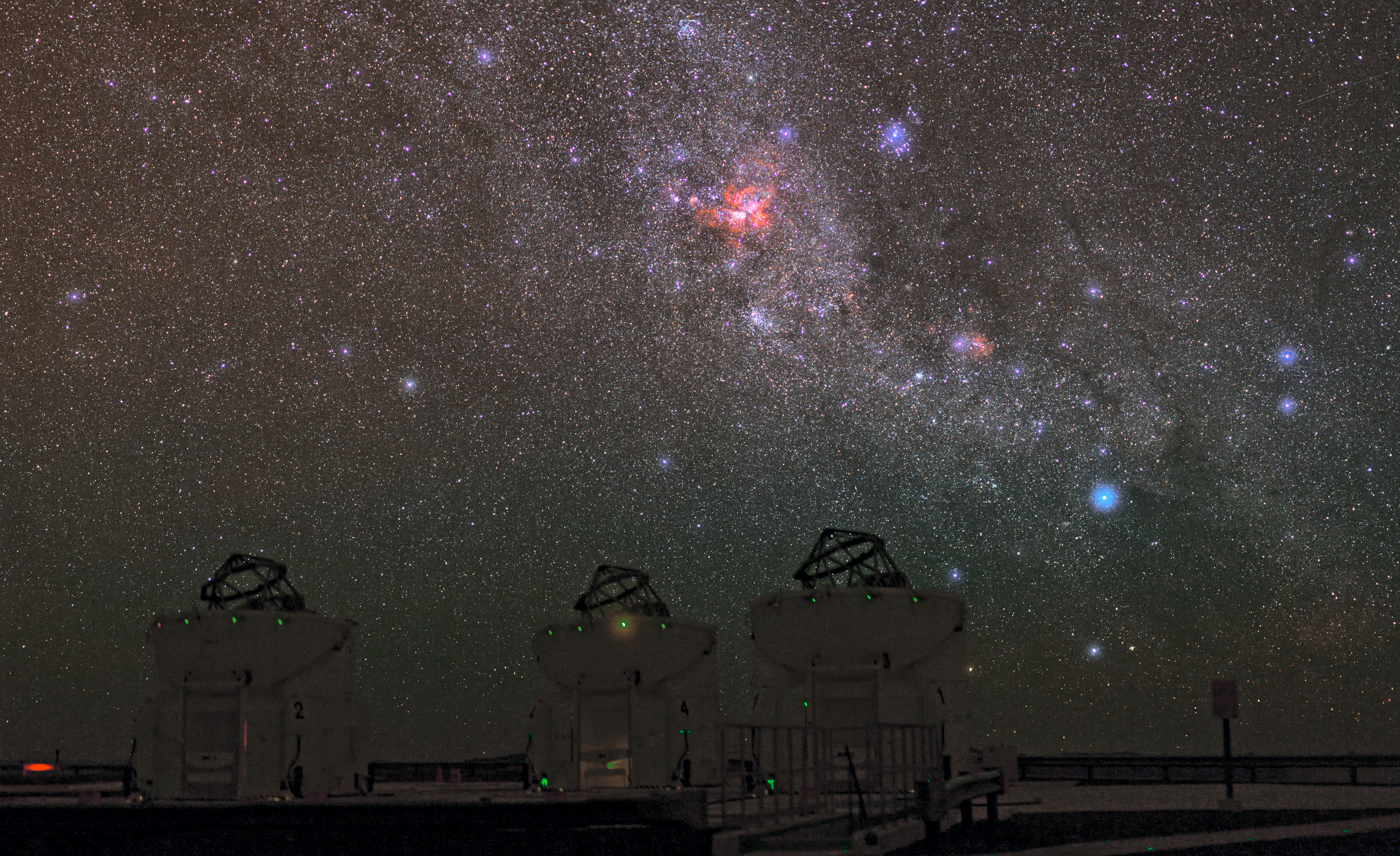 I forgrunden ser vi tre af de fire hjælpeteleskoper (Auxillary Telescope: AT) på Very Large Telescope Interferometer (VLTI). Med VLTI kan ATerne – eller VLTs 8,2 meter enhedsteleskoper – bruges sammen som et enkelt kæmpestort teleskop, der kan se finere detaljer end det ville være muligt med de enkelte teleskoper. VLTI har været brugt til en bred vifte af forskning, herunder studiet af skiver omkring unge stjerner samt aktive galaksekerner, der er blandt de mest energirige og mystiske fænomener i universet.