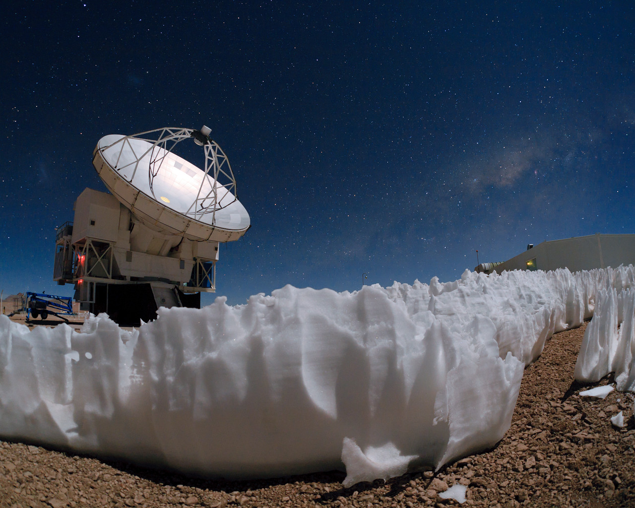 På nattehimlen over og til venstre for APEX ses henholdsvis den Lille og Store Magellanske Sky som svage lyspletter. De er nabogalakser til vores egen galakse, Mælkevejen. Selve Mælkevejen ses som et diset bånd tværs over himlen, mest tydeligt over APEX’ kontrolbygning til højre. Mørke pletter i båndet er områder, hvor lyset fra fjerne stjerner er blokeret af interstellart støv. Skjult bag disse mørke støvbånd er Mælkevejens centrum i en afstand på ca. 27.000 lysår. Teleskoper som APEX er afgørende redskaber for astronomerne for at kunne se gennem støvet og studere vores galakses centrum i detaljer.