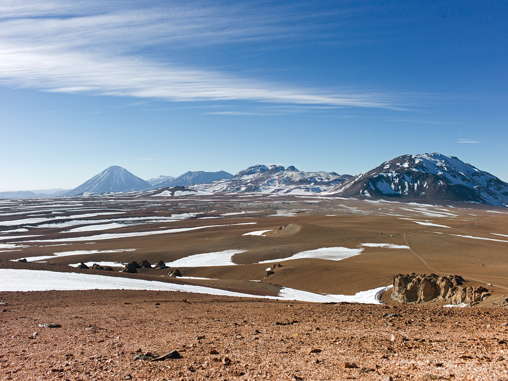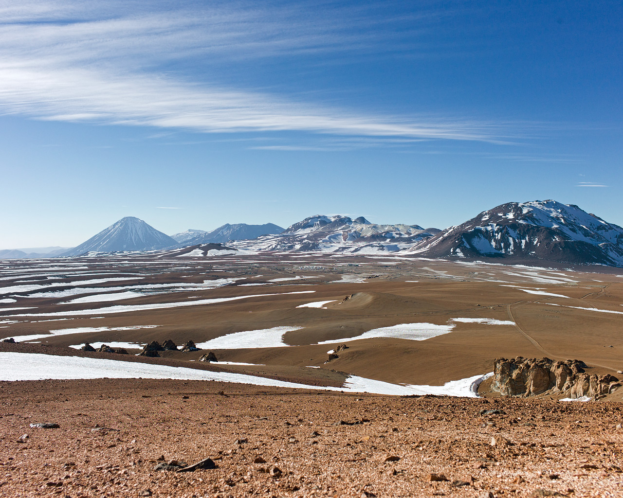 Ved første øjekast viser dette billede det bjergrige sceneri på Chajnantor-højsletten i Chile med sne og is spredt ud over det golde terræn. De primære bjergtinder fra højre mod venstre er Cerro Chajnantor, Cerro Toco, Juriques og den markante kegleformede vulkan Licancabur (se potw1240) – ganske imponerende! Billedets virkelige stjerner er imidlertid de bittesmå, kun netop synlige strukturer lige midt i billedet – mulige at opfatte, hvis du ser rigtig godt efter.
