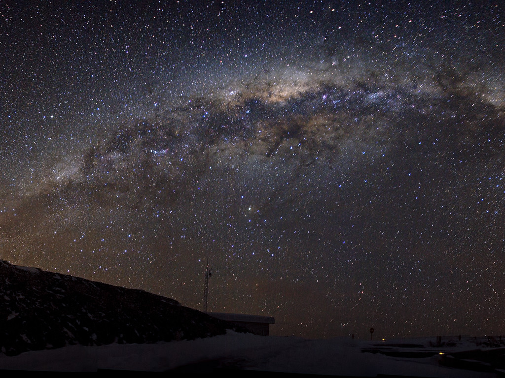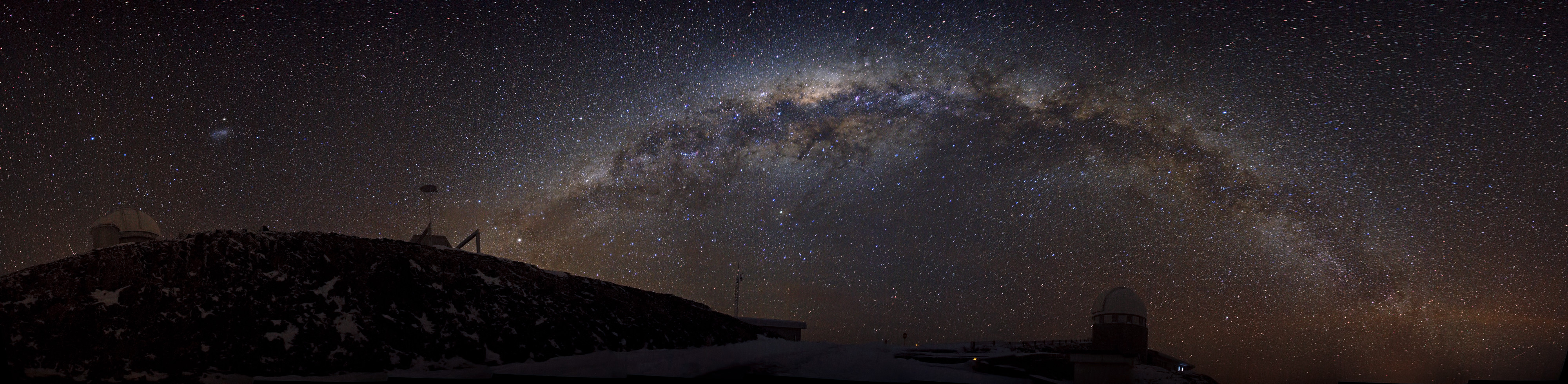 Dette panoramabillede, taget af Alexandre Santerne, viser vores hjemgalakse Mælkevejens skive indefra, samt en kold vinternat med et drys af sne på ESOs La Silla-observatorium i Chile. Fra vores udsigtspunkt inde i Mælkevejen, ses dens skive som et funklende bånd af stjerner, der strejker sig over himlen. I dette panoramabillede er Mælkevejen forvrænget til en halvbue på grund af vidvinkelprojektionen.