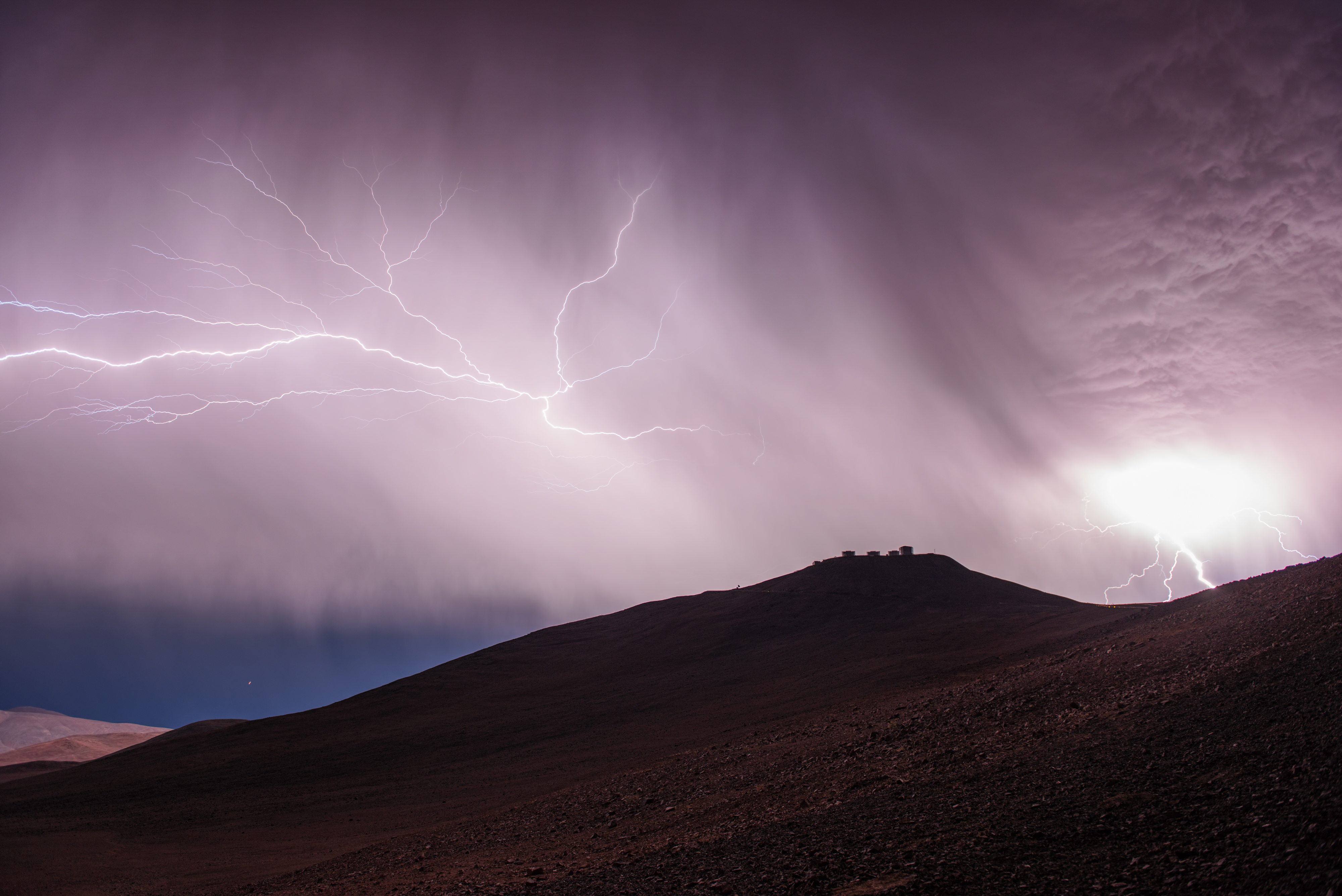 Adskillige teleskoper kan ses i billedet. For eksempel er den store, kantede bygning for enden af vejen New Technology Telescope (NTT). Tro mod sit navn inkluderede teleskopet, da det var færdigbygget i 1989, et antal revolutionerende funktioner, herunder at det var det første til at bruge fuld aktiv optik såvel som en revolutionerende ottekantet afskærmningskonstruktion. Mange af NTTs funktioner gik videre til at blive inkorporeret i ESOs Very Large Telescope.