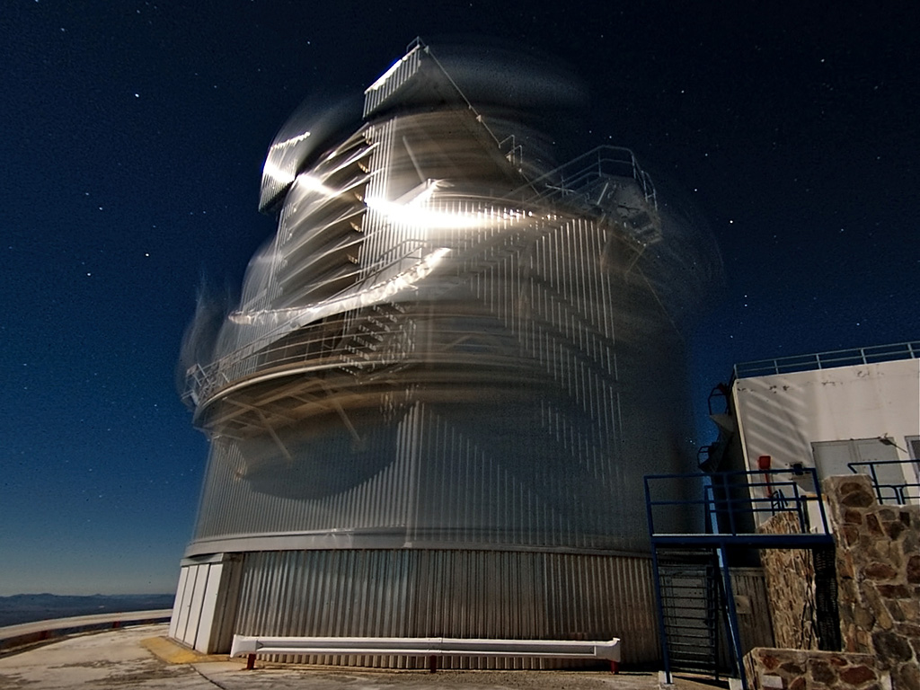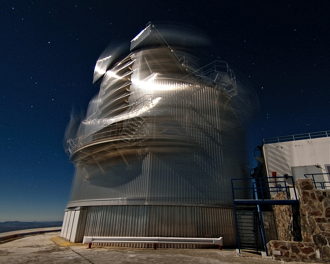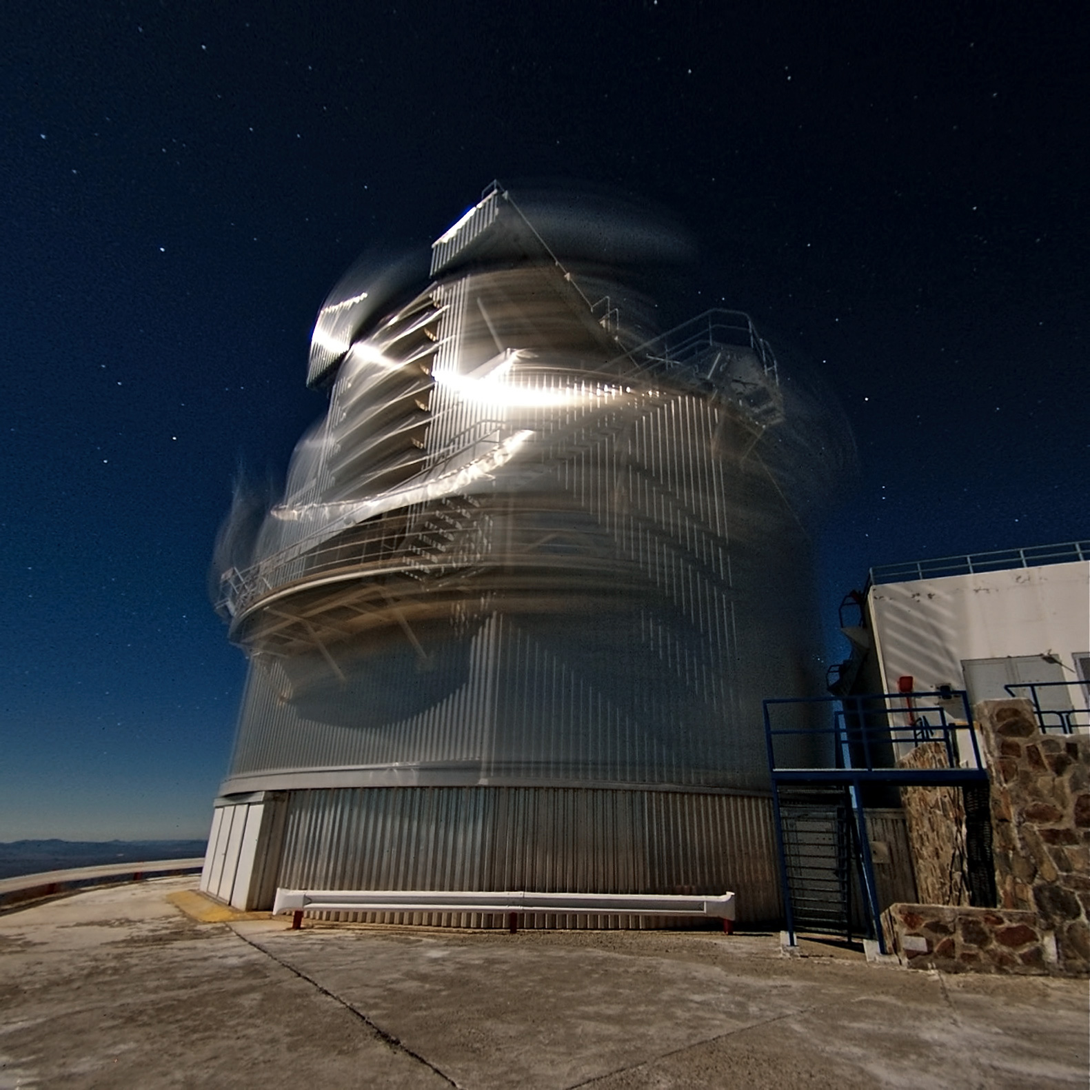 Dette dynamiske billede viser New Technology Telescope (NTT) beliggende ved ESOs La Silla Observatorium i Chile. Den markant formede teleskopbygning fremstår i billedet sløret af bevægelse, da teleskopet roterer for at sigte mod dets næste mål. Billedet blev taget med en 30-sekunders eksponering.