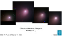 On July 4, 2005, the NASA Deep Impact spacecraft will visit Comet 9P/Tempel 1. It will launch a 360 kg impactor that should produce a crater on the surface of the comet and a plume of gas and dust. This experiment will be the first opportunity to study the crust and the interior of a comet. As the material inside the comet's nucleus is pristine, it will reveal new information on the early phases of the Solar System. It will also provide scientists with new insight on crater physics, and thereby give a better understanding on the crater record on comets and other bodies in the Solar System. The scientific outcome of the experiment depends crucially on pre-impact and follow-up observations. ESO will actively participate in the post-impact observations. As soon as Comet 9P/Tempel 1 is visible after the impact from Chile , and for a whole week thereafter, all major ESO telescopes - i.e. the four Unit Telescopes of the Very Large Telescope Array at Paranal, as well as the 3.6m, 3.5m NTT and the 2.2m ESO/MPG telescopes at La Silla - will be observing Comet 9P/Tempel 1, in a coordinated fashion and in very close collaboration with the space mission' scientific team. Among all observatories, the ESO La Silla Paranal Observatory will thus provide the best coverage of this one of its kind event. First images of ESO telescopes will be obtained shortly after midnight - European time - on the night of July 4 to 5 and will be directly made available on this web site. |