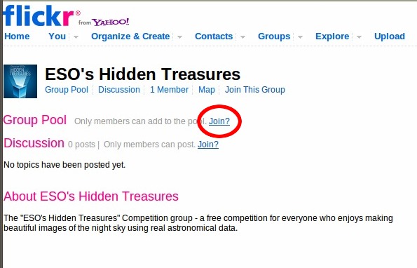 You need to upload your image to the ESO Hidden Treasures group. First, upload them on Flickr: click on "You" menu -> Upload photo and videos, then "Chose photos and videos". On next page, make sure you select "Public" in the privacy settings, and hit "upload" –this can take sometime. Write the relevant information in the caption of the image, and save. |