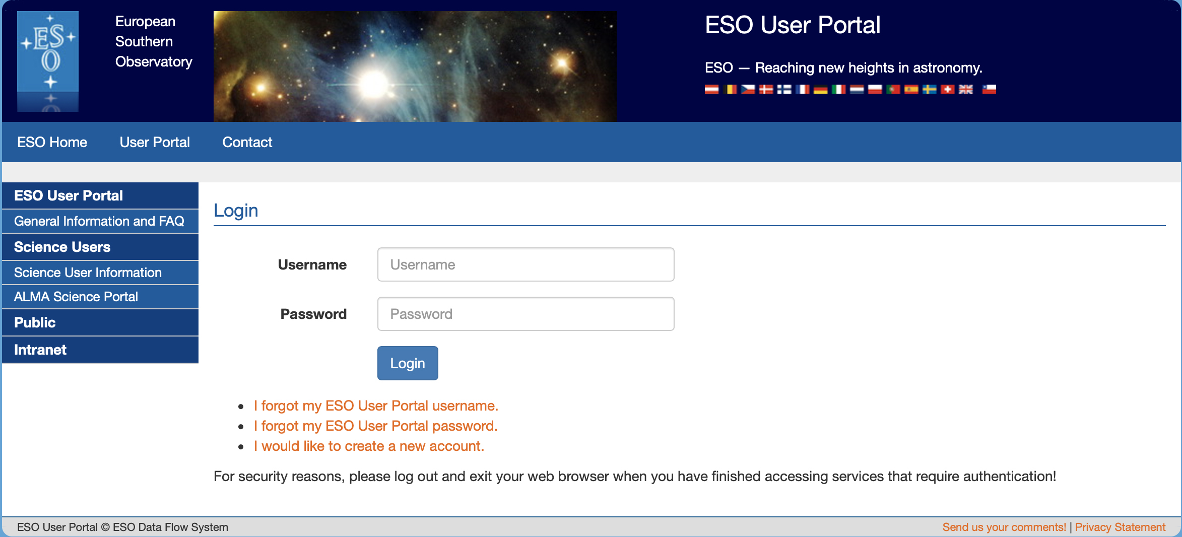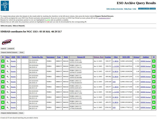 Open the Science Archive query form, and start digging! 1. First challenge: selection of the imagesYou can restrict the search for a given object (for instance: Target Name = NGC 1313), or for an area around given coordinates. Select some (or all) instruments (for instance, FORS1). Select “On-the-sky exposures” to get actual data. You can further restrict the search for a given time range (the date format is DD MM YYYY, for instance from 15 12 2003 to 17 12 2003), and then click Search. You will get a long list of frames that you can retrieve. If you followed this example, which is encoded as the default values for the entries in the form, you will have found the files that were used for this image of NGC 1313 You may also retrieve this example dataset just by hitting return on the form. At a later stage, you will need to retrieve the biases and flat-fields. You can restrict the dates around the selected observations using the start and end night fields, and select the filter by typing its identifier in the “Filter” field. Use % as the wild-card character, eg %V% will retrieve all the filters containing “V”. 2. Data retrievalOnce you have identified a series of frame that can constitute a hidden treasure, mark them (little box on the left), and click the “Request” button. You will then be asked to log onto the ESO User Portal. If you don't have an account already, you will need to create one: follow the link “I would like to create a new account”. This process is very quick, and of course all data provided are treated confidentially). For the “Profile Category” entry, select “Amateur Astronomer” (unless another category fits you better). For the “Media Type” entry, select FTP. You will receive an email with a link that activates your account. Note that if you select another data retrieval method, you will not get the data. Also note that there is a 30GB limit for each request. If you really need more data, you will need to split the requests into several consecutive requests. 3. Second challenge: data processingAll the data are stored in FITS format. It is therefore critical that you know how to do the astronomical processing for these files, and that you have software than can do it. If you don't know about this file format or are not interested in finding out more, this competition is probably not for you. The images all need to be de-biased and flat-fielded. It is then likely you will want to stack several images obtained through the same filter. 4. Third challenge: image combinationThe subsequent processing to go from a FITS file to a standard graphics format can, for instance, be done with the ESA/ESO/NASA FITS Liberator or with Stiff and Photoshop or GIMP. You can process the data in any way you want, and combine them as you wish. The end or intermediate results can be enhanced using any technique. The only thing that is strictly forbidden is to paint on the image. Only tiny cosmetic defects can be painted over, such as cosmic rays, bad pixels, satellite trails, etc. 5. Upload the resultOnce you have produced an image you are pleased with, save the original file in your working format (for instance .psd for Photoshop, or .xcf for GIMP), and generate a moderately sized JPEG for submission. Keep the original – we shall request it if you are shortlisted for a prize. First join the “ESO's Hidden Treasures” group in Flickr. If you don’t have a Flickr account, create a free one on www.flickr.com In the Group Pools, click "Join" link, then "Join this group".