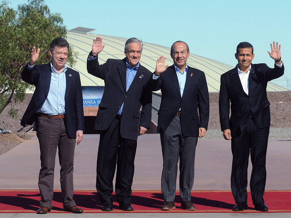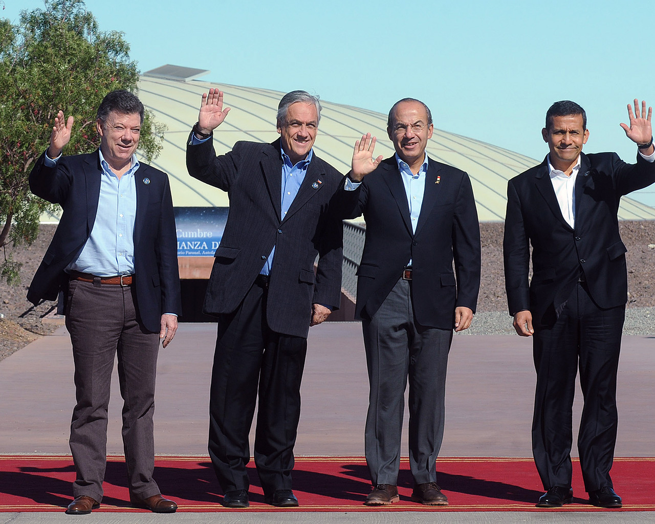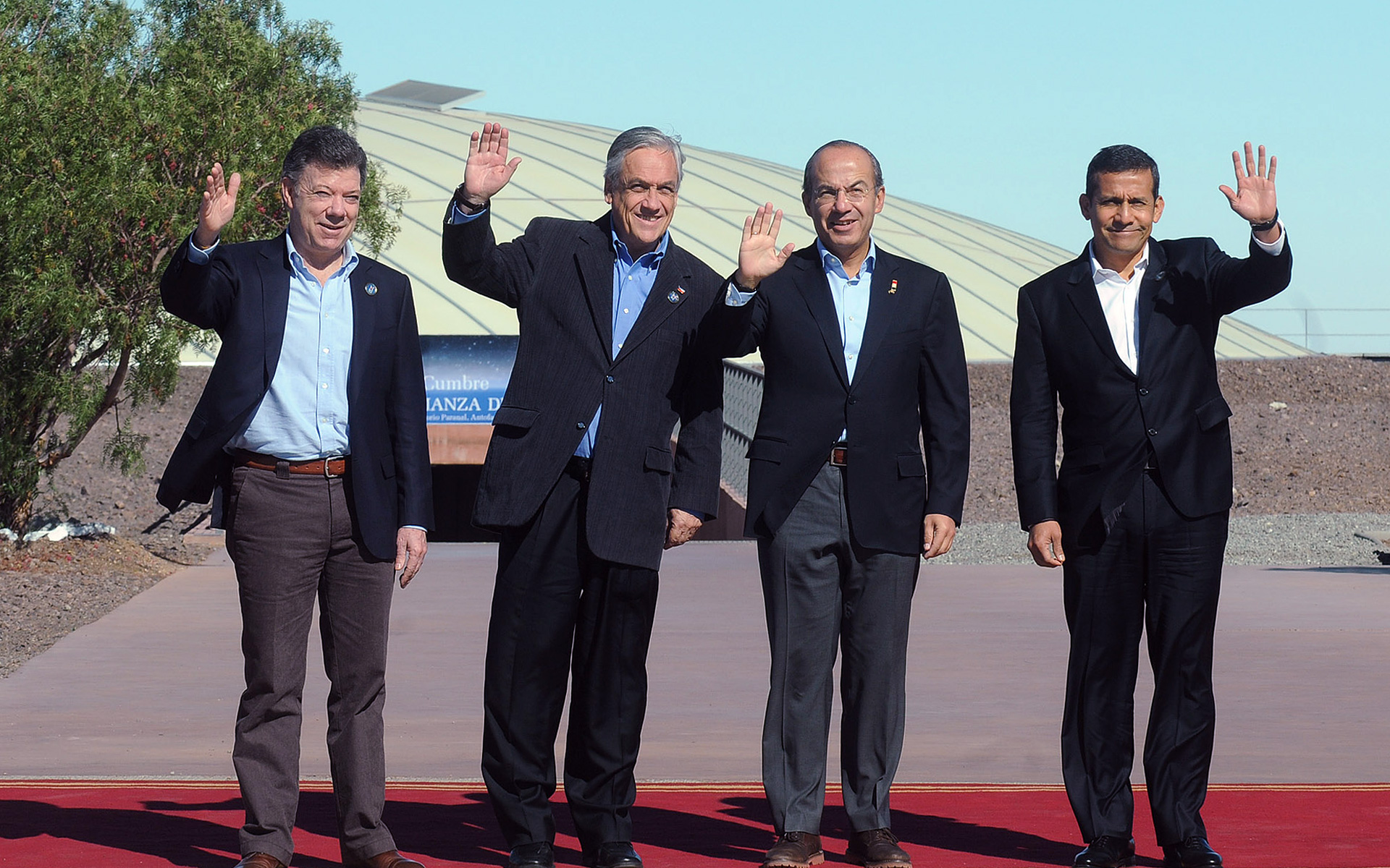 Tyynenmeren liiton neljän maan - Chile, Kolumbia, Meksiko ja Peru - presidentit Paranalin majoitusrakennuksen edustalla. Vasemmalta oikealle Kolumbian Juan Manuel Santos, Chilen Sebastián Piñera, Meksikon Felipe Calderón ja Perun Ollanta Humala.