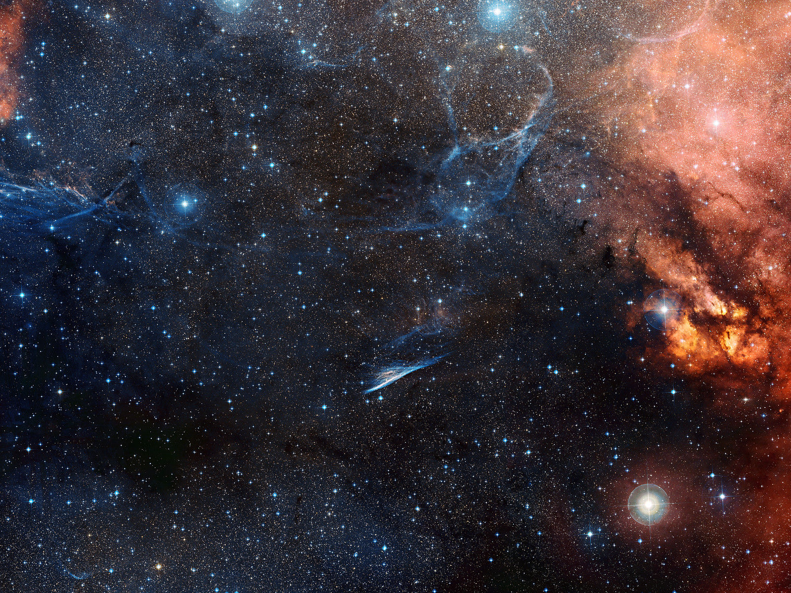 Tämä kuva taivaasta Kynäsumun ympärillä esittää näyttävää, taivaallista maisemaa, jossa on Purjeen supernovajäänteen sinisiä rihmoja, vetypilvien punaista hohdetta ja lukemattomia tähtiä. Se on koostettu eri värisistä Digitized Sky Survey 2 -kartoitukseen kuuluvista valokuvista.