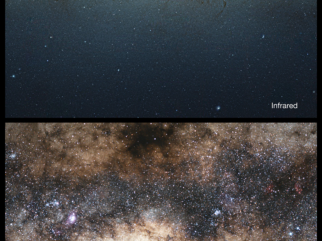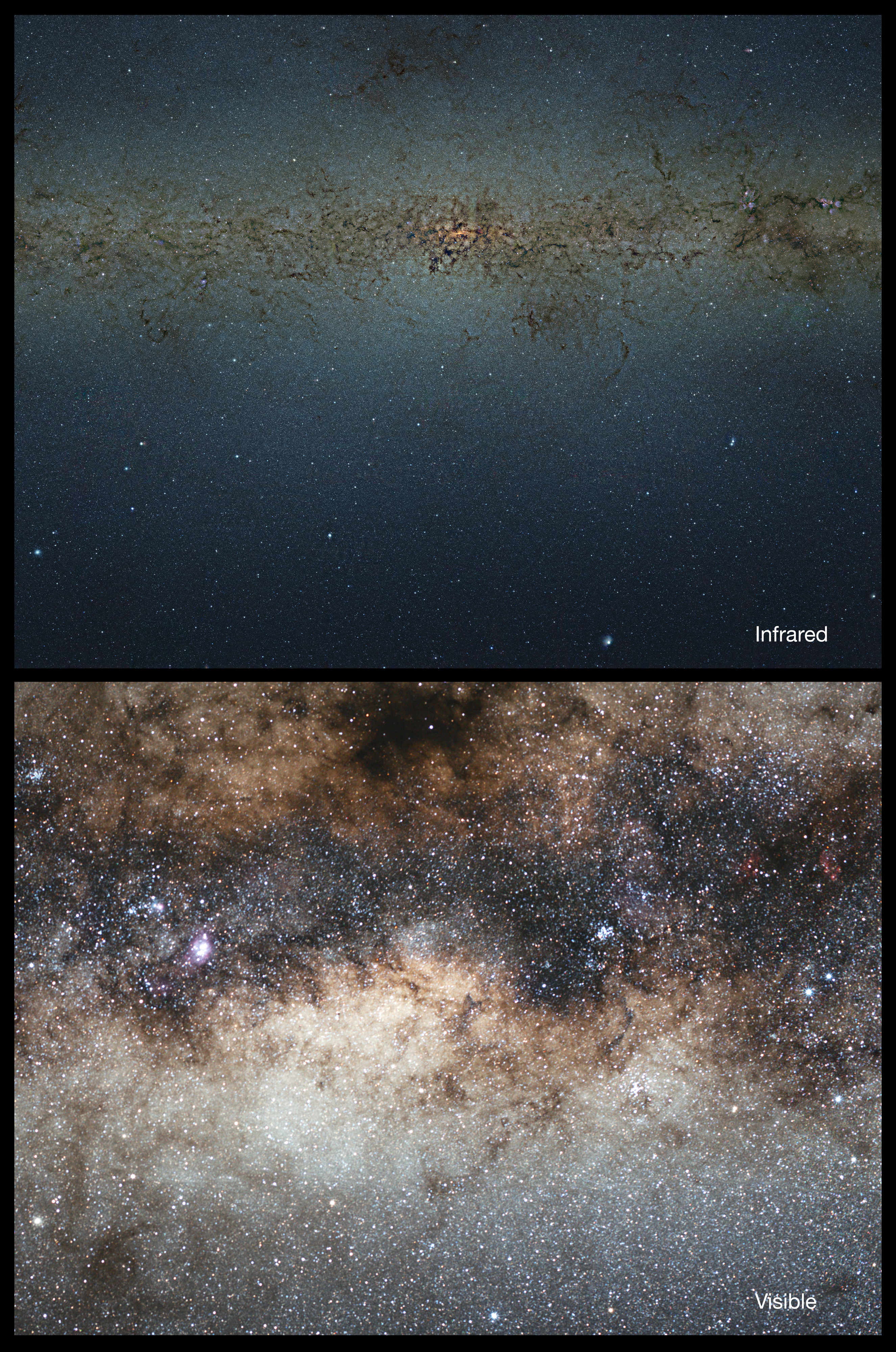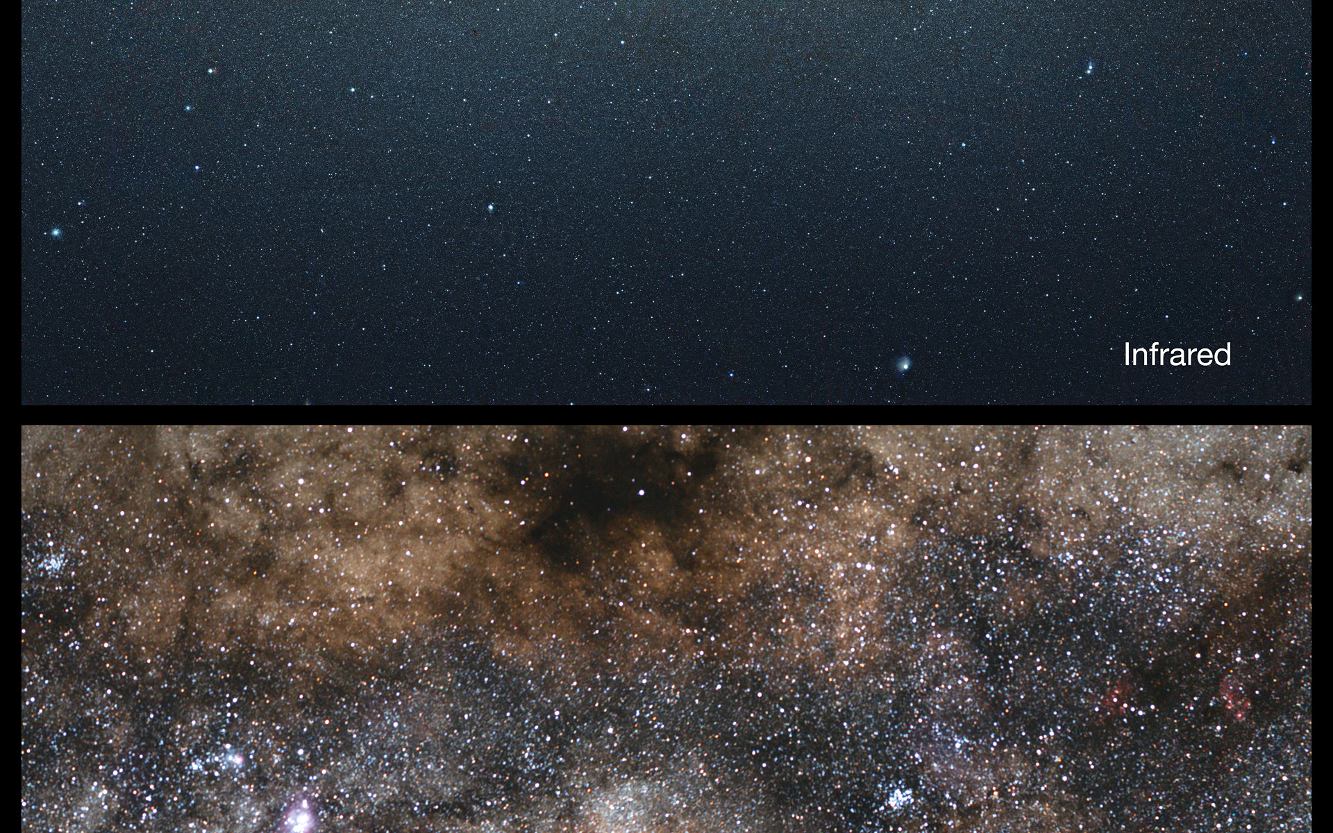 Tämä näyttävä näkymä vertaa VISTA:n kartoitusteleskoopin valtavaa infrapunavalolla taltioitua mosaiikkikuvaa pienemmällä teleskoopilla otettuun näkyvän valon mosaiikkikuvaan samasta alueesta. Koska VISTA:ssa on infrapunavalolle herkkä kamera, se näkee läpi suuresta osasta näkymää peittävää tomua ja antaa hyvin selkeän näkymän Linnunradan keskiosien tähtipaljouteen.