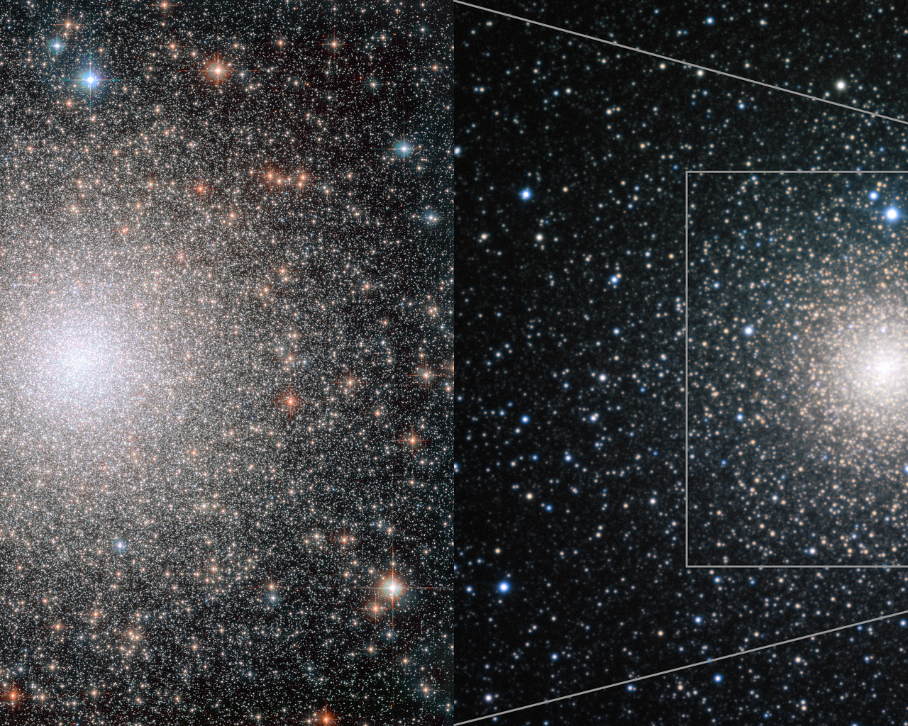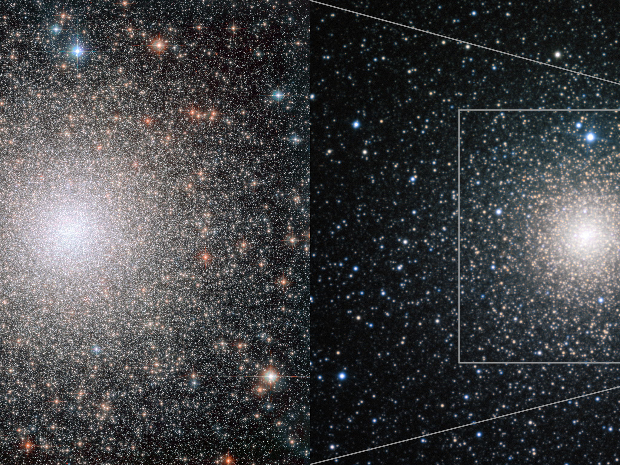 Tämä kuva esittää pallomaista tähtijoukkoa NGC 6388 havaittuna Hubblella (vasemmalla) ja maanpäällisellä teleskoopilla (oikealla). Hubble tarjoaa paljon yksityiskohtaisemman kuvan, josta tähtitieteilijät voivat erottaa tähtiä joukon keskustaa myöten, kun taas ESO:n Chilessä sijaitsevan La Sillan observatorion MPG/ESO 2.2-metrin teleskoopin kuva tarjoaa laajemman näkökentän, johon mahtuvat mukaan tähtijoukon uloimmat osat.