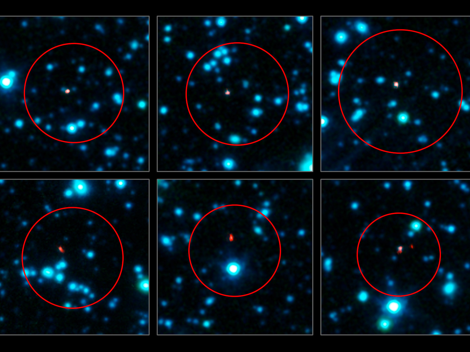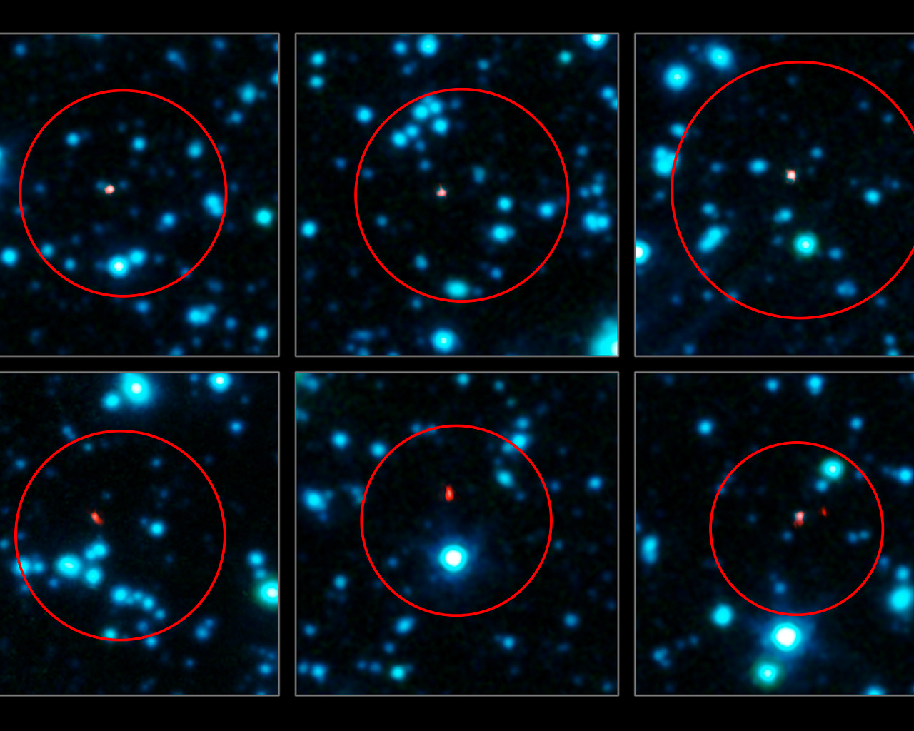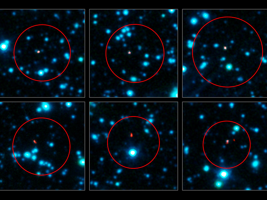 Tämä kuva esittää kuutta galaksia, jotka nähdään ALMA:n uusissa havainnoissa (punaisella). Suuret punaiset ympyrät osoittavat alueita, joissa APEX oli havainnut galakseja. Varhaisemmat teleskoopit eivät saaneet riittävän tarkkoja kuvia tunnistaakseen varsinaista galaksia tarkasti, joten jokaisesta ympyrästä löytyy useita ehdokkaita. ALMA:n alimillimetriaallonpituuksien havainnot on esitetty oranssin ja punaisen värisinä Spitzer-avaruusteleskoopin IRAC-kameralla otetun samaa kenttää esittävän infrapunakuvan päällä.