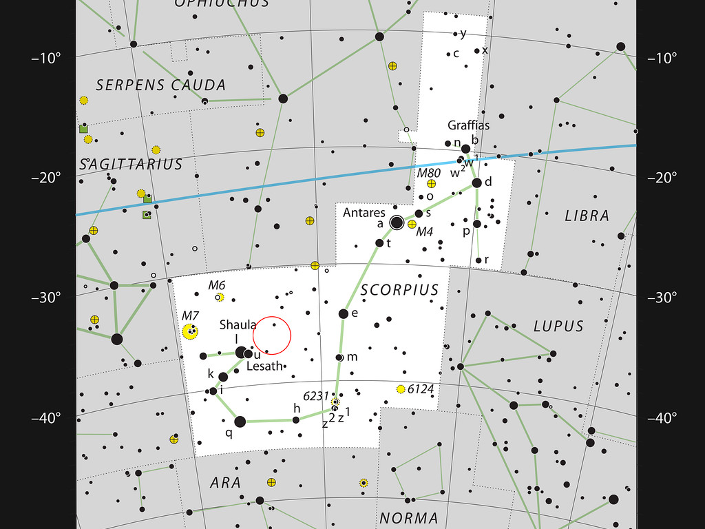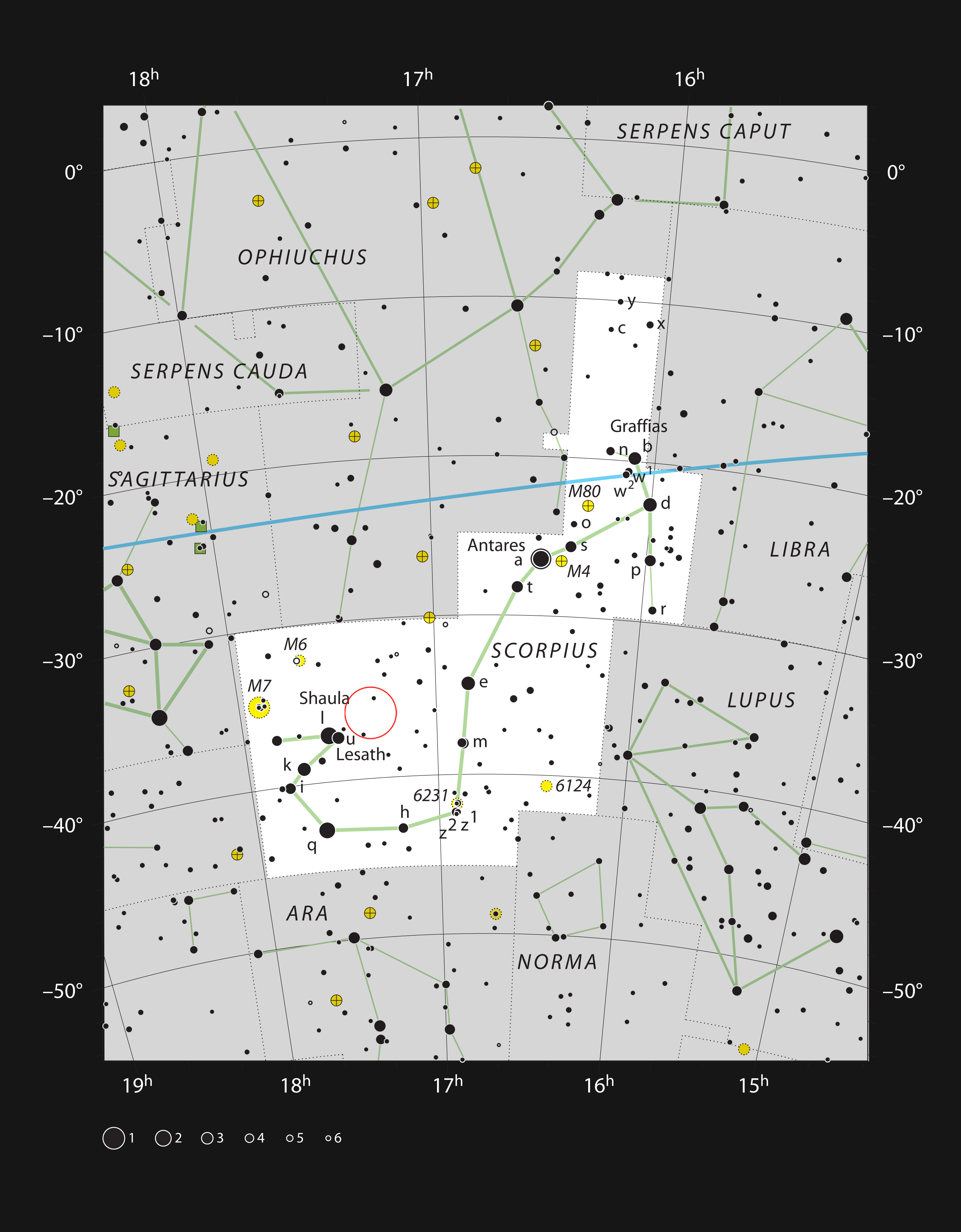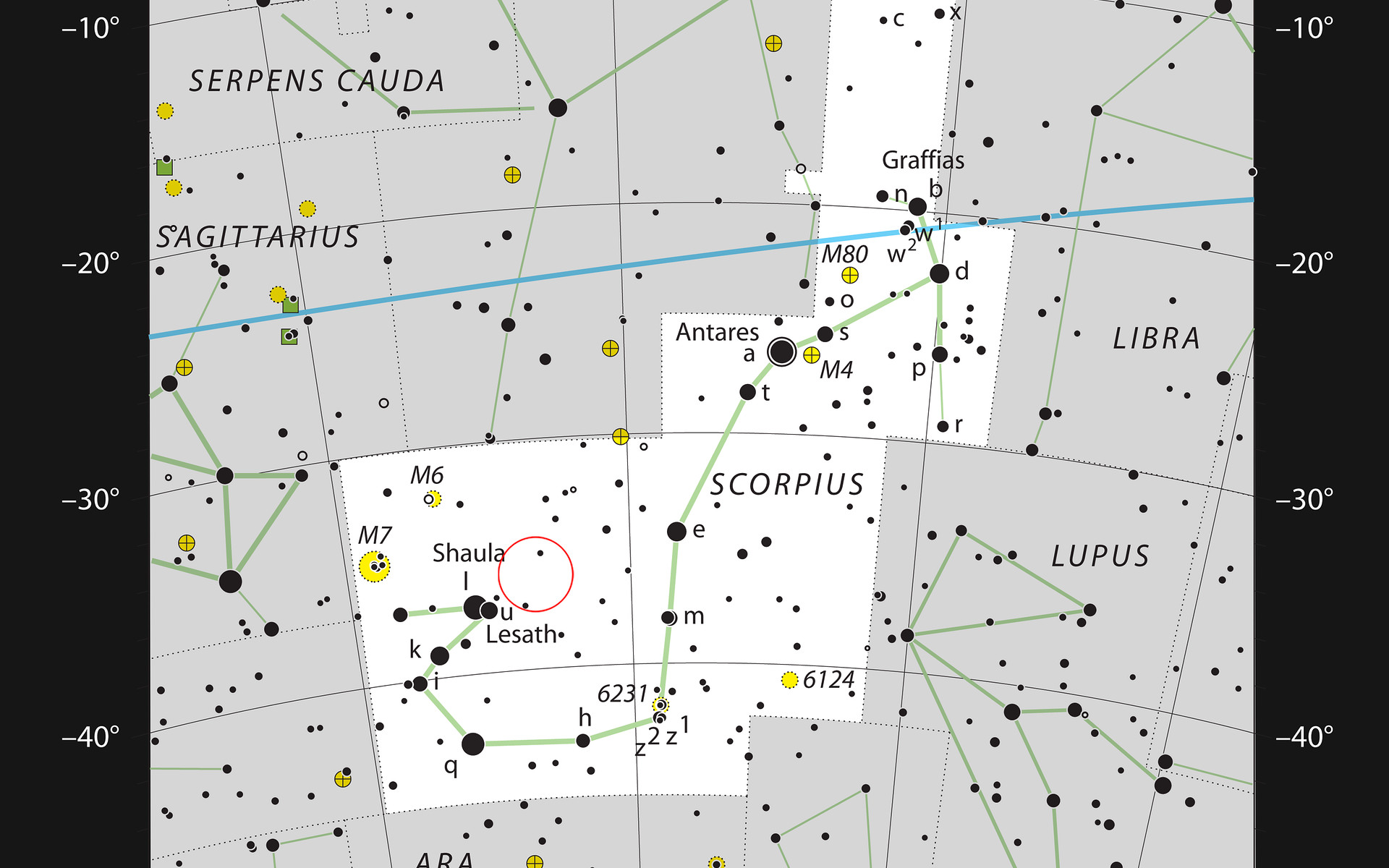 Tämä tähtikartta esittää tähtienmuodostusalueen NGC 6334, Kissankäpäläsumun, sijainnin Skorpionin tähdistössä (Scorpius). Kartassa näkyvät useimmat hyvissä havainto-olosuhteissa paljaalla silmällä näkyvät tähdet ja alueen NGC 6334 sijainti on osoitettu kuvassa punaisella ympyrällä. Vaikka tämä tähtien lastentarha on silmiinpistävä kuvissa, se on himmeä näkyvän valon aallonpituuksilla ja tarvitaan suuri teleskooppi, jotta nähdään vilkaisu kirkkaammista osista.
