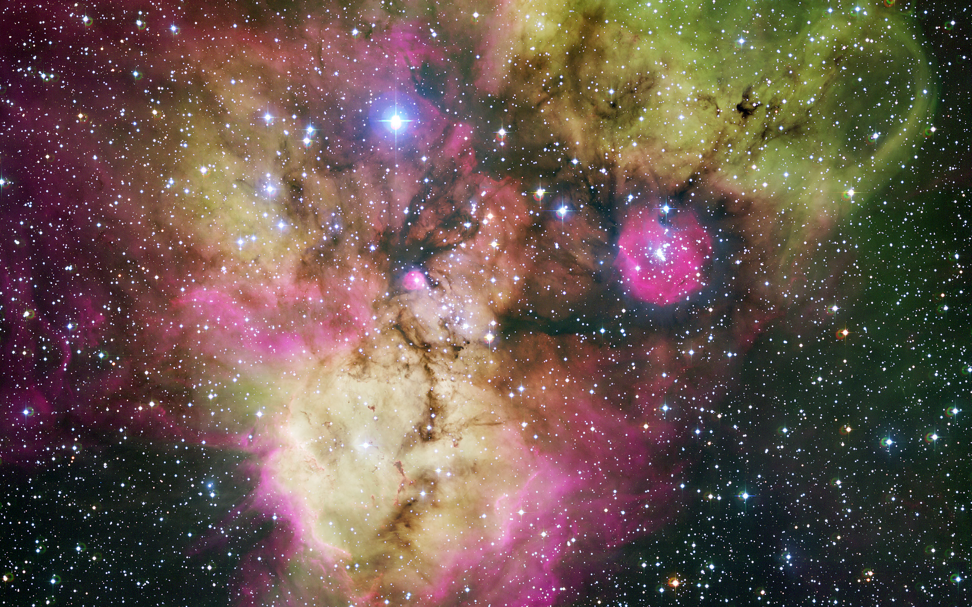 La zone autour de l'amas stellaire NGC 2467, situé au sud de la constellation de Poupe. Avec un âge de quelques millions d'années tout au plus, c'est une crêche stellaire très active avec des étoiles se formant continuellement à partir des nuages de poussières et de gaz. L'image, ressemblant à un fantôme cosmique coloré ou un mandrill céleste géant, contient les amas Haffner 18 (centre) et Haffner 19 (centre droit, dans la zone rose ressemblant à l'œil le plus bas du mandrill) tout comme des vastes régions contenant du gaz ionisé. L'étoile brillante au centre de la plus grande région rose en bas de l'image est HD 64315, une jeune étoile massive aidant à modeler la structure de toute la région de la nébuleuse.
