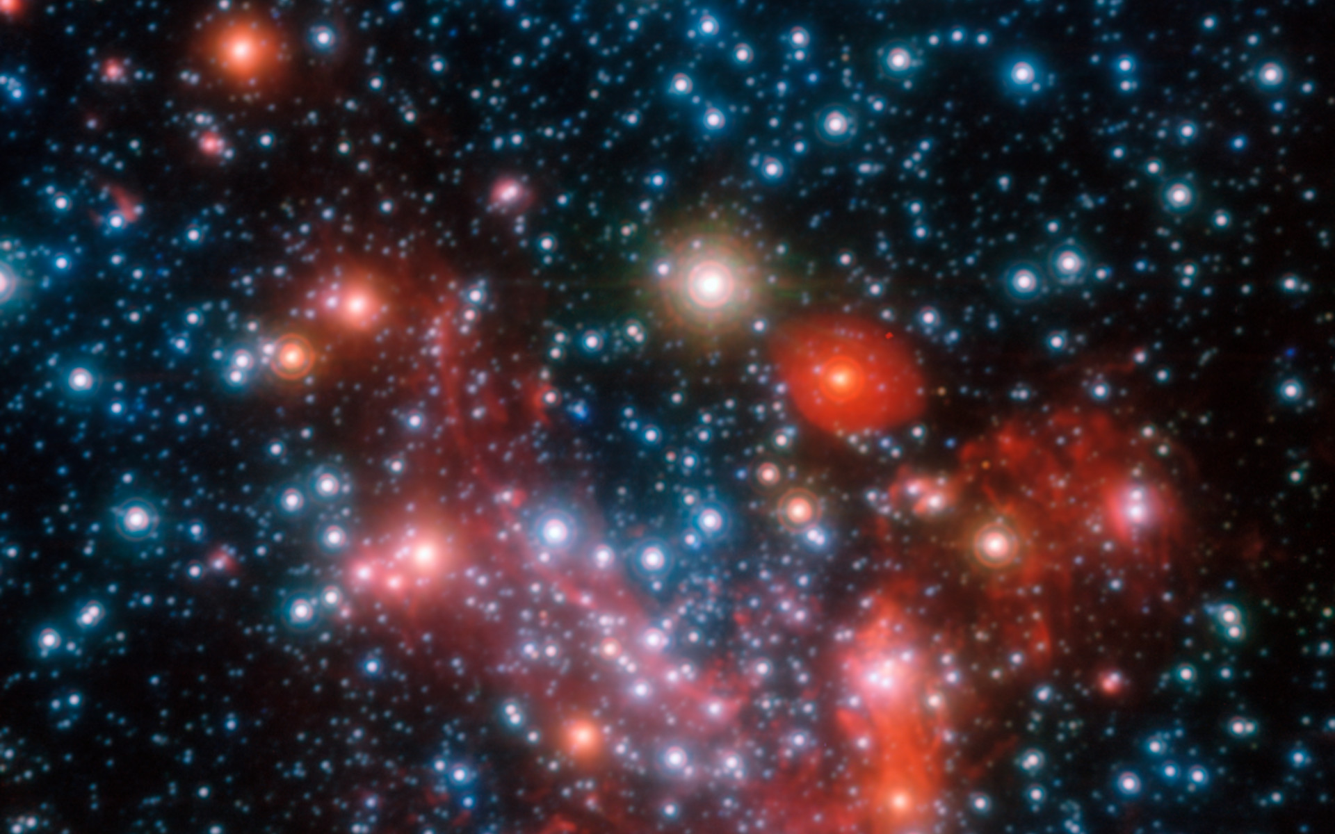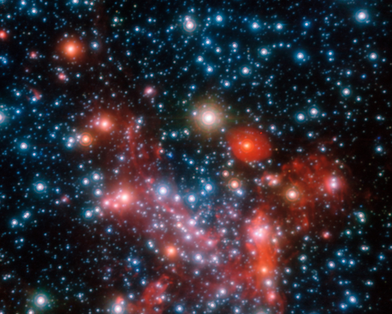 Les parties centrales de notre galaxie, la Voie Lactée, observées dans le proche infrarouge avec les instruments NACO sur le VLT (Very Large Telescope) de l'ESO. En observant le mouvement des étoiles centrales durant plus de 16 ans, les astronomes ont pu déterminer la masse du trou noir supermassif qui s'y trouve.