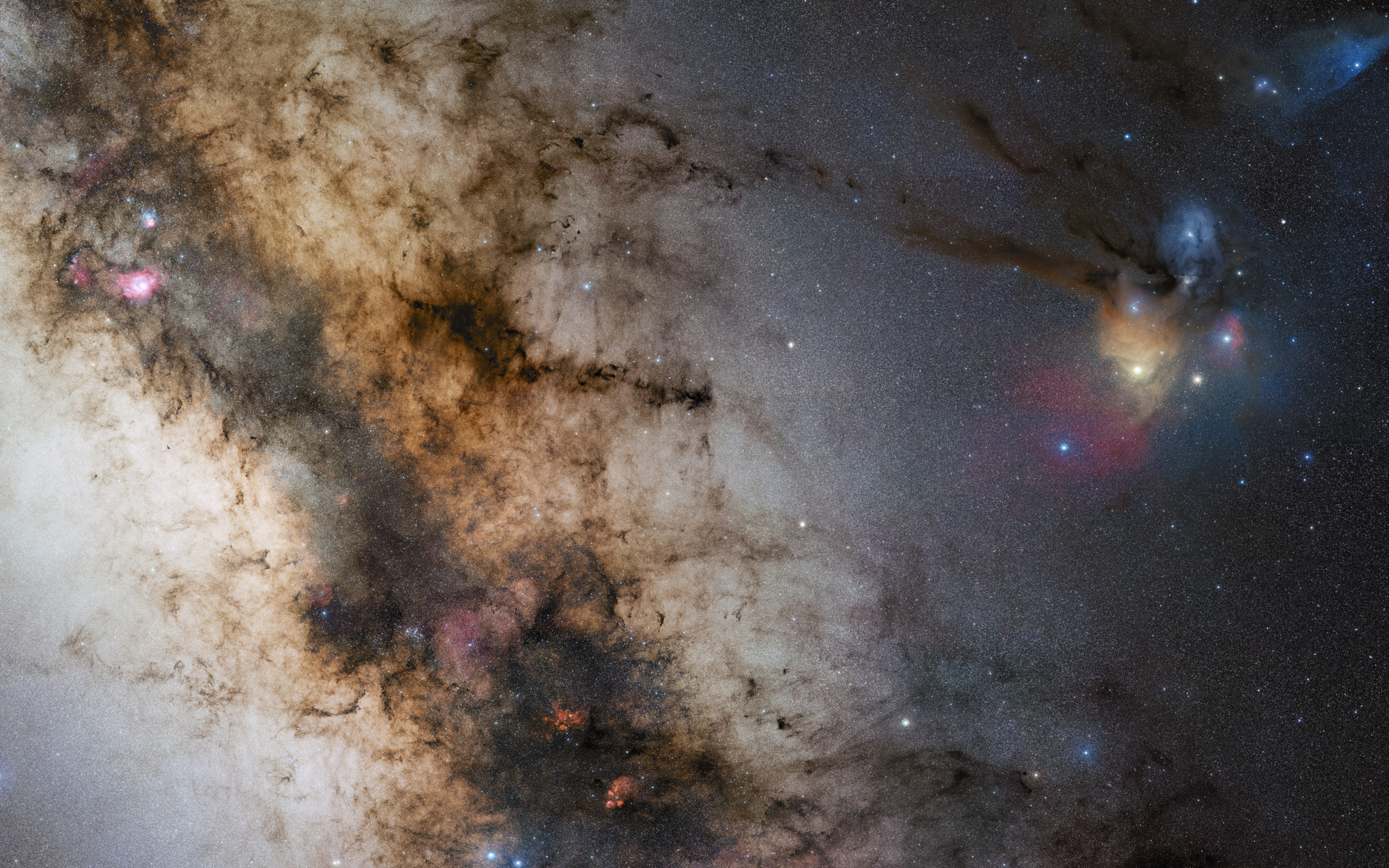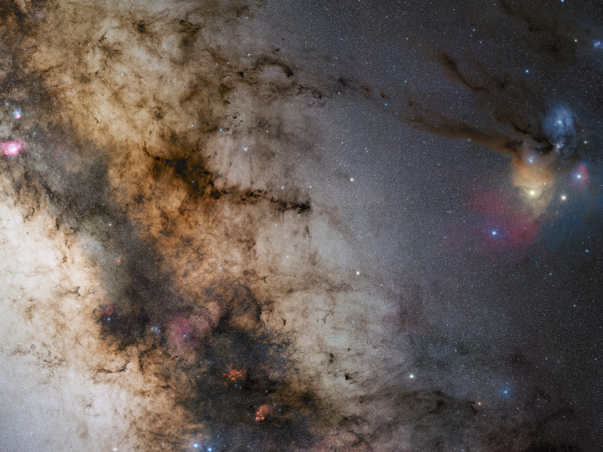 La seconde de trois images du projet ESO GigaGalaxy Zoom est un nouveau et fabuleux panorama à 340 millions de pixels des parties centrales de notre galaxie, une image à 34 par 20 degrés qui nous donne une vue telle que les astronomes amateur autour du globe le voient. Prise par Stéphane Guisard, un ingénieur ESO et un astrophotographe mondialement connu, à Cerro Paranal, où se trouve le Very Large Telescope de l'ESO, cette seconde image bénéficie de la qualité du ciel de Paranal, qui est l'un des meilleurs au monde. Elle montre la région du ciel allant de la constellation du Sagittaire à celui du Scorpion. Les régions très colorés de Rho Ophiuchi et Antarès sont visibles sur la gauche tout comme les régions plus sombres tels que la nébuleuse du Serpent et celle de la Pipe. La ligne poussiéreuse de notre Voie Lactée traverse l'image obliquement avec des nébuleuses rougeâtre telles que celles du Lagon et du Trifide, tout comme NGC 6357 et NGC 6334. Cette ligne sombre contient également le centre de notre galaxie où un trou noir supermassif se trouve. L'image a été obtenue en observant avec un 10-cm Takahashi FSQ106ED f/3.6 télescope et une SBIG STL CCD caméra utilisant un NJP160 support. Les images ont été prises à travers différents filtres (B, V et R) et ont ensuite été mises ensemble. Cette mosaïque a été assemblée à partir de 52 différentes vues du ciel comprenant environ 1200 photos individuelles avec une durée d'exposition totale de 200 heures, l'image finale a une taille de 24 403 x 13 973 pixels. L'image en résolution complète n'est disponible que par le biais de Stéphane Guisard.