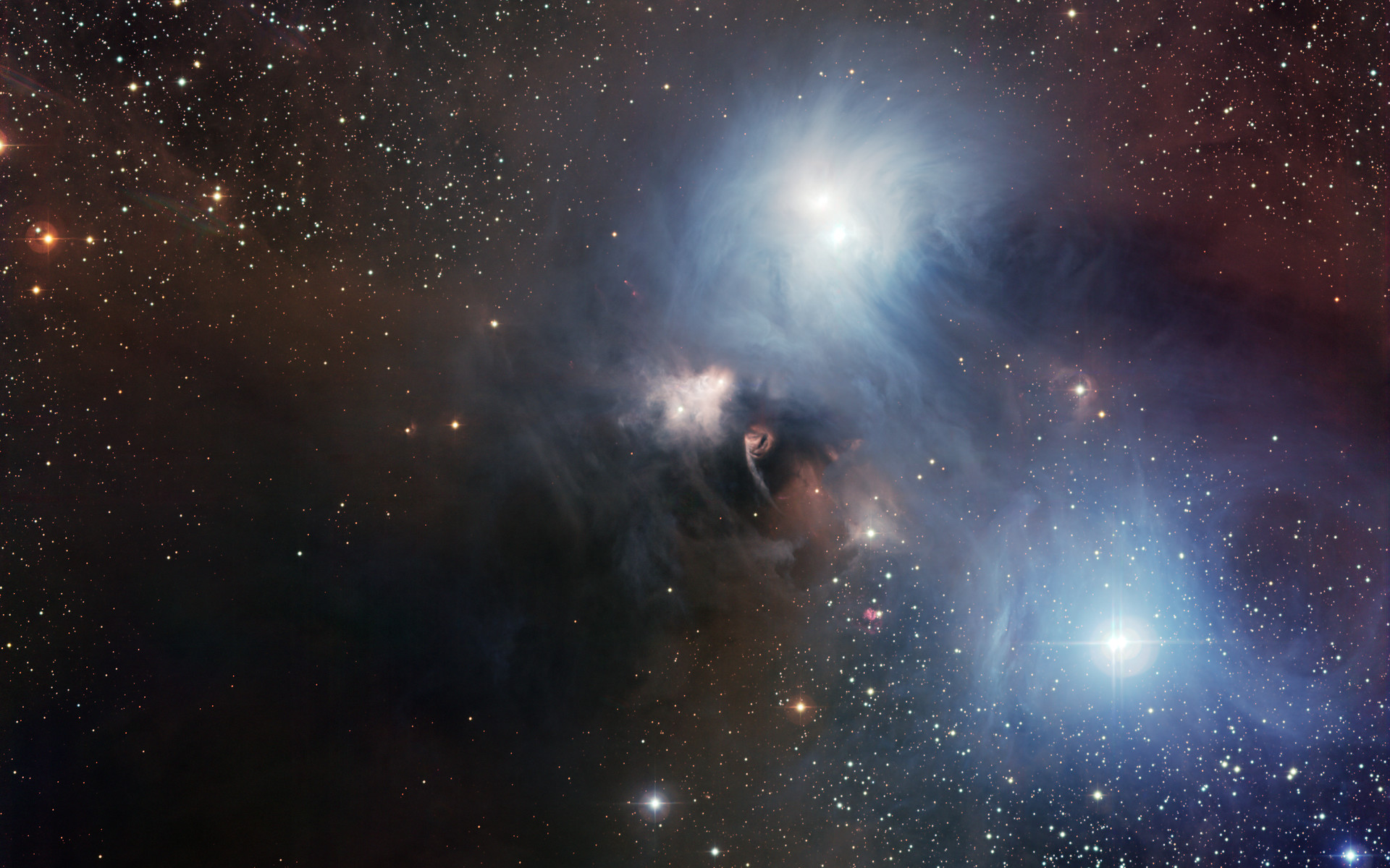 La proche région de formation d'étoiles autour de l'étoile R Coronae Australis prise par le Wide Field Imager (WFI) sur le MPG/ESO 2.2 mètres télescope à l'observatoire ESO de la Silla au Chili. Cette photo qui couvre un champ de 33.7 x 31.9 arcminutes (Environ le diamètre de la pleine Lune), est une combination de 12 images CCD, chacune faisant 67 Megapixels, prises à travers des filtres B, V et R avec quatres expositions de cinq minutes chaque.