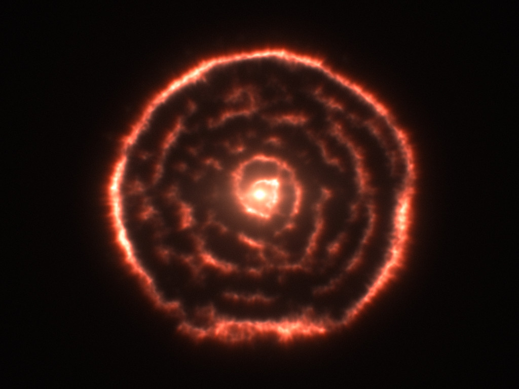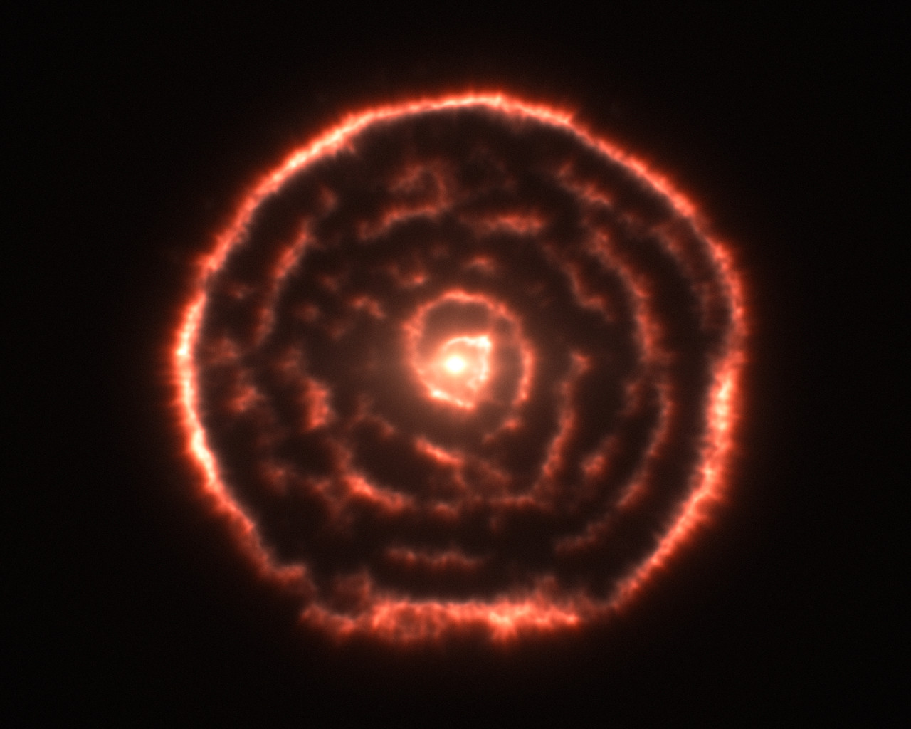 Des observations réalisées avec ALMA (Atacama Large Millimeter/submillimeter Array) ont dévoilé une structure spirale inattendue dans la matière qui entoure la vieille étoile R Sculptoris. Cette structure, jamais vue auparavant, est probablement causée par un compagnon stellaire caché, en orbite autour de l'étoile. Cette tranche dans les données d'ALMA a révélé l'enveloppe autour de l'étoile qui a mis en évidence le disque circulaire externe ainsi qu'une structure spirale très nette dans la matière interne.