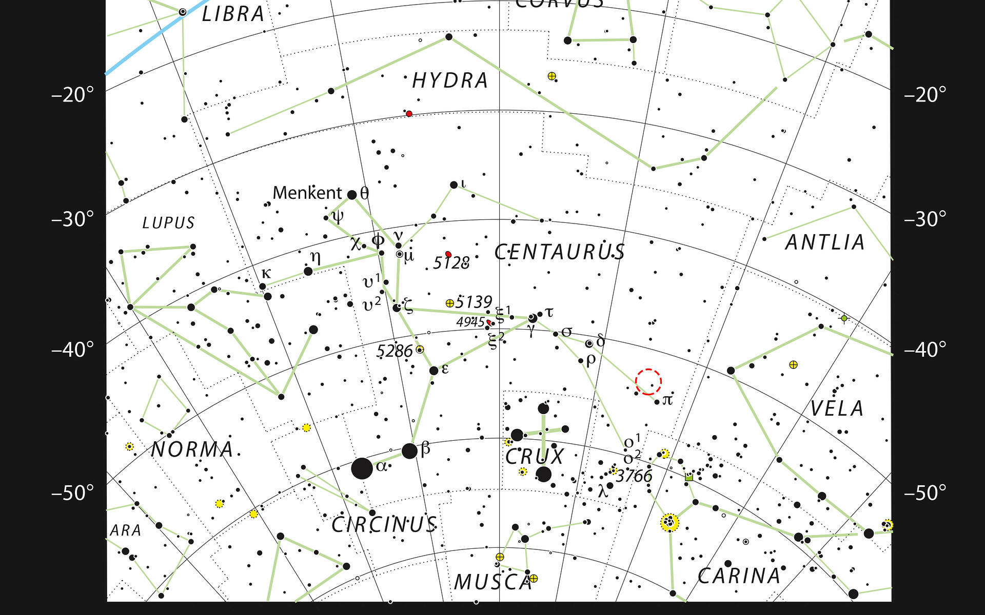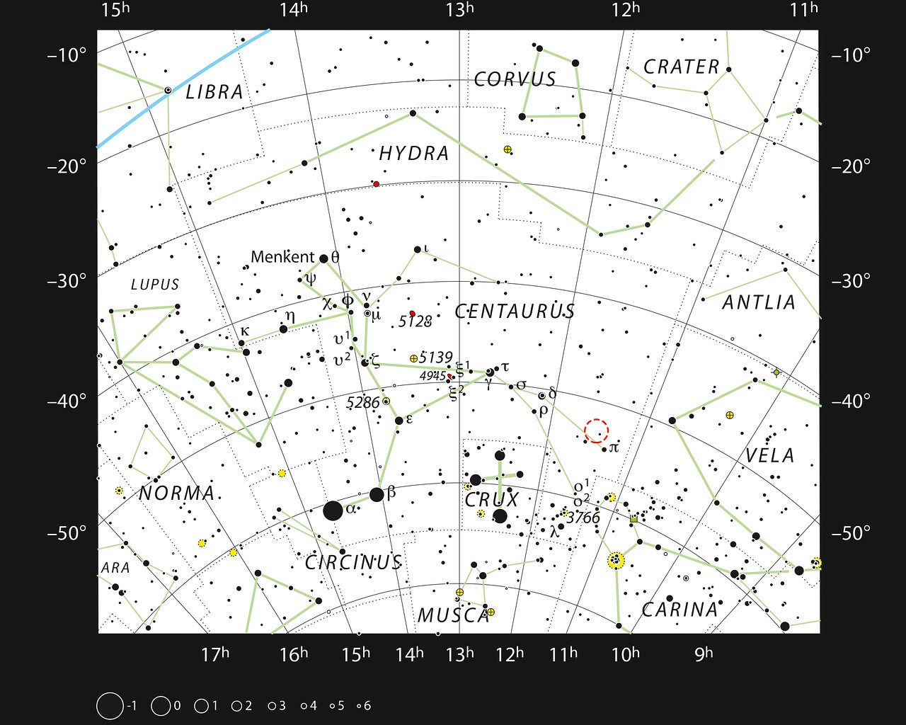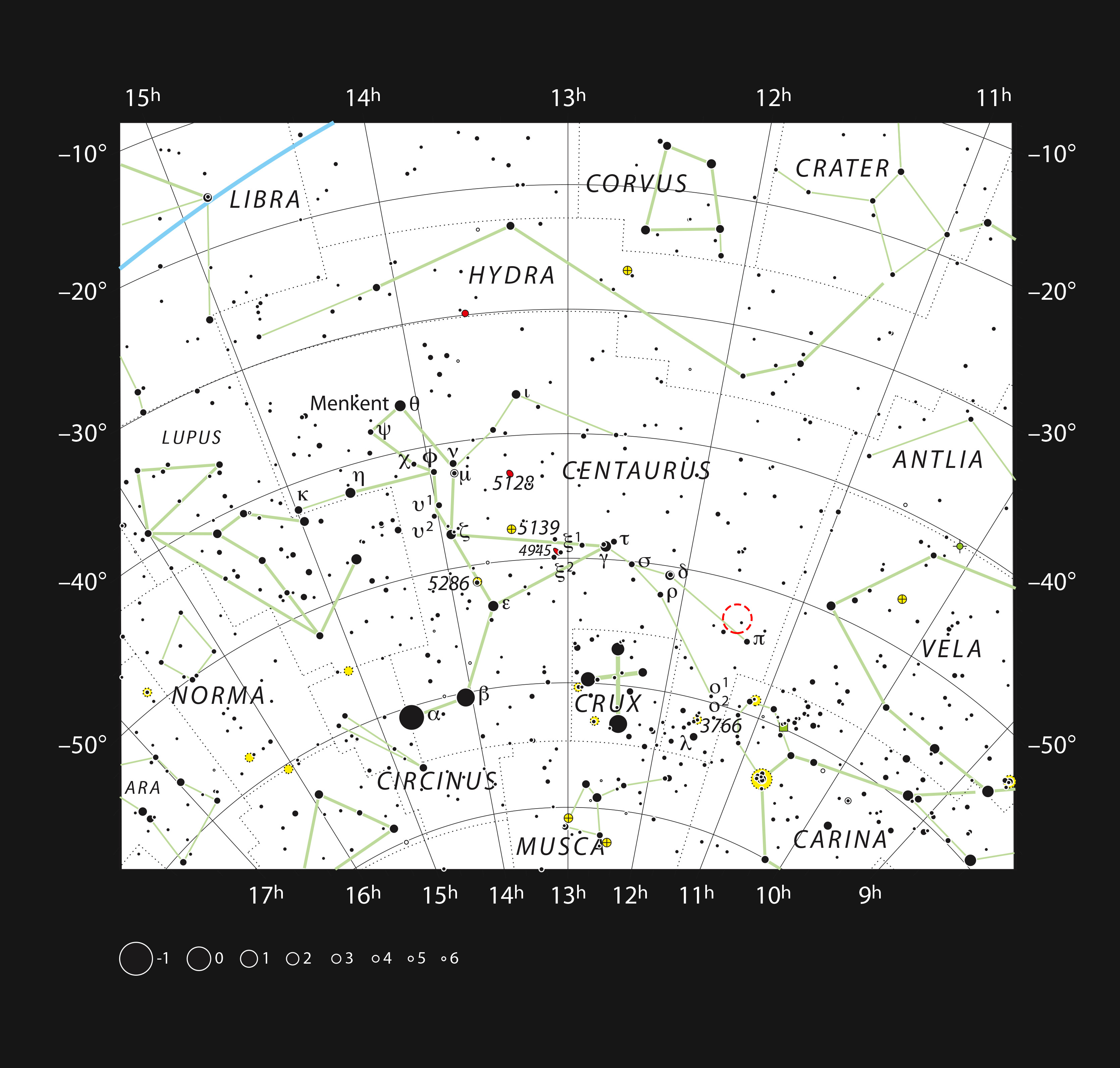 Ce graphe montre la localisation de la nébuleuse planétaire Fleming I dans la constellation australe du Centaure. Cette carte montre la plupart des étoiles visibles à l'œil nu dans de bonnes conditions atmosphériques, et la localisation de la nébuleuse est précisée par un cercle de couleur rouge sur l'image. Cette nébuleuse planétaire est petite et peu brillante et ne peut être aperçue qu'à l'aide des plus grands télescopes amateurs.