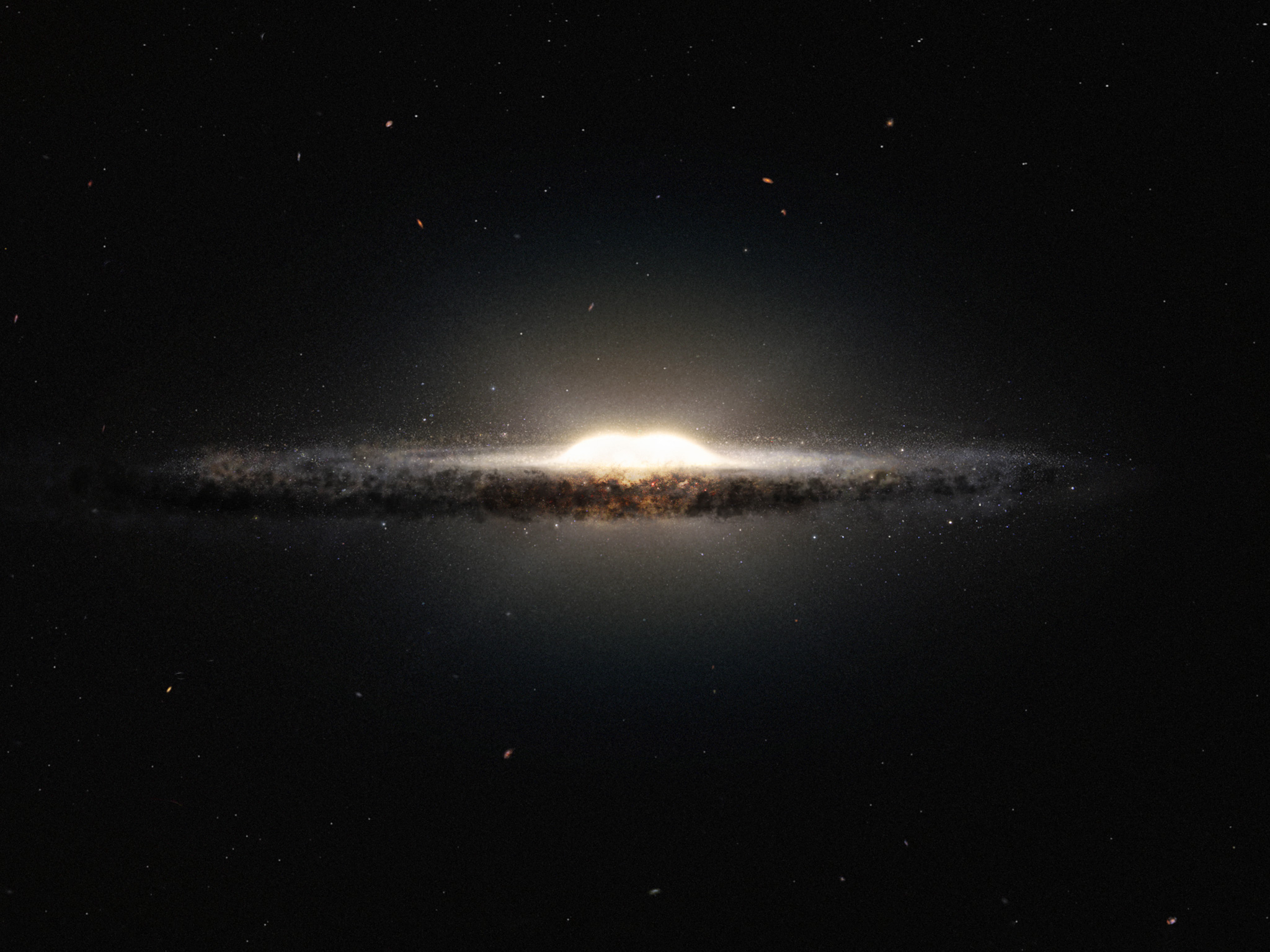 Cette vue d'artiste montre ce à quoi notre galaxie, la Voie Lactée, ressemblerait, si nous l'observions depuis le dessus et sous un autre angle que celui sous lequel nous l'apercevons depuis la Terre. Le bulbe central apparaît sous la forme d'une cacahuète constituée d'étoiles rougeoyantes et les bras spiraux ainsi que les nuages de poussière associés forment une bande étroite.