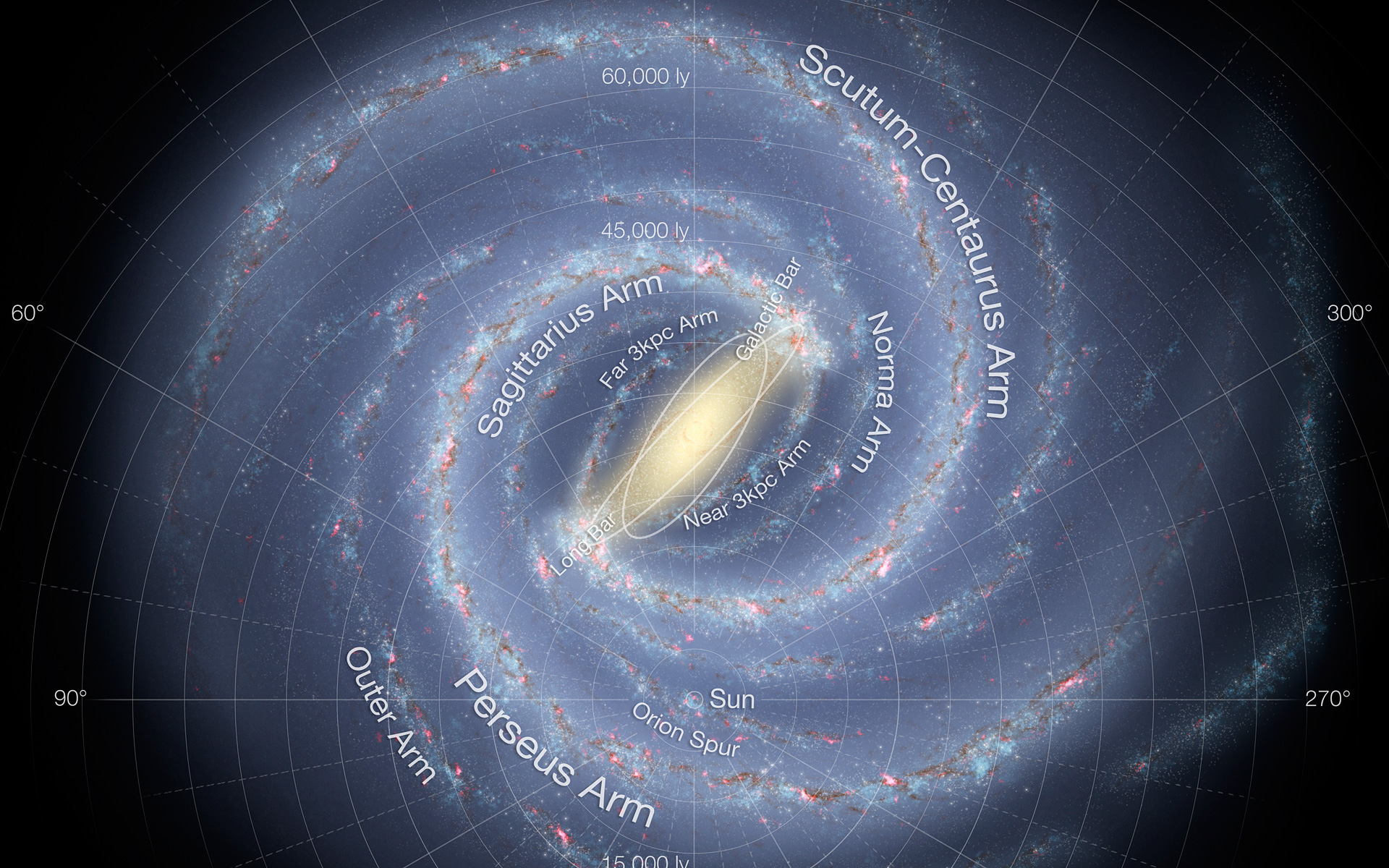 Cette vue d'artiste détaillée et annotée montre la structure de la Voie Lactée, y compris la localisation des bras spiraux et d'autres constituants tel le bulbe. Cette image a fait l'objet d'une mise à jour afin d'intégrer les récents éléments de cartographie du bulbe central déduits du sondage effectué par le télescope VISTA de l'ESO qui équipe l'Observatoire de Paranal de l'ESO.