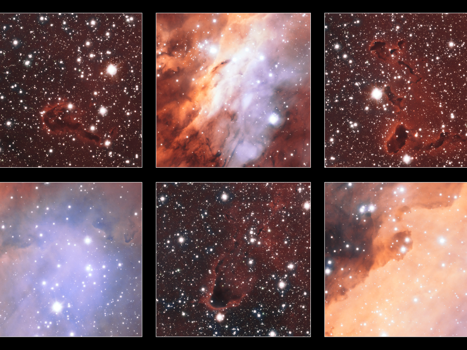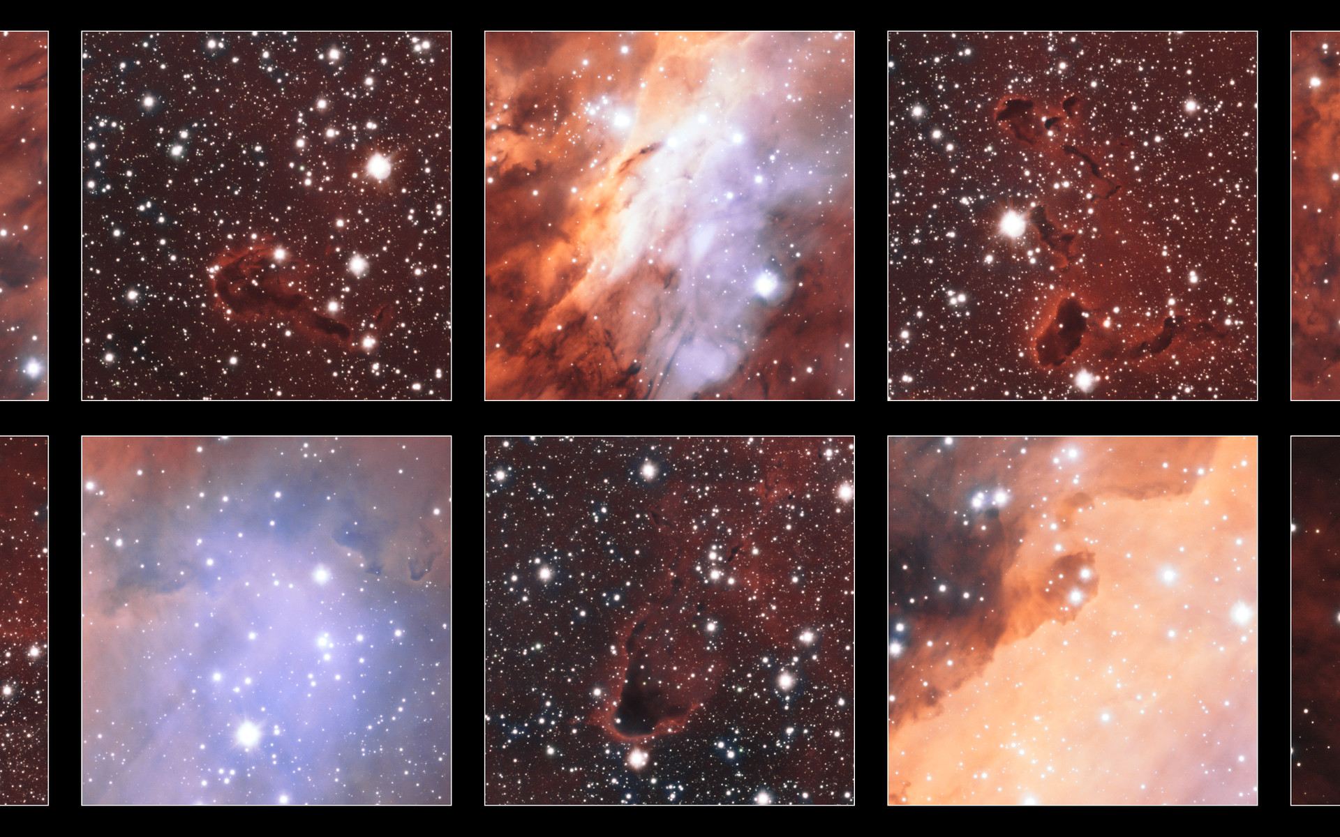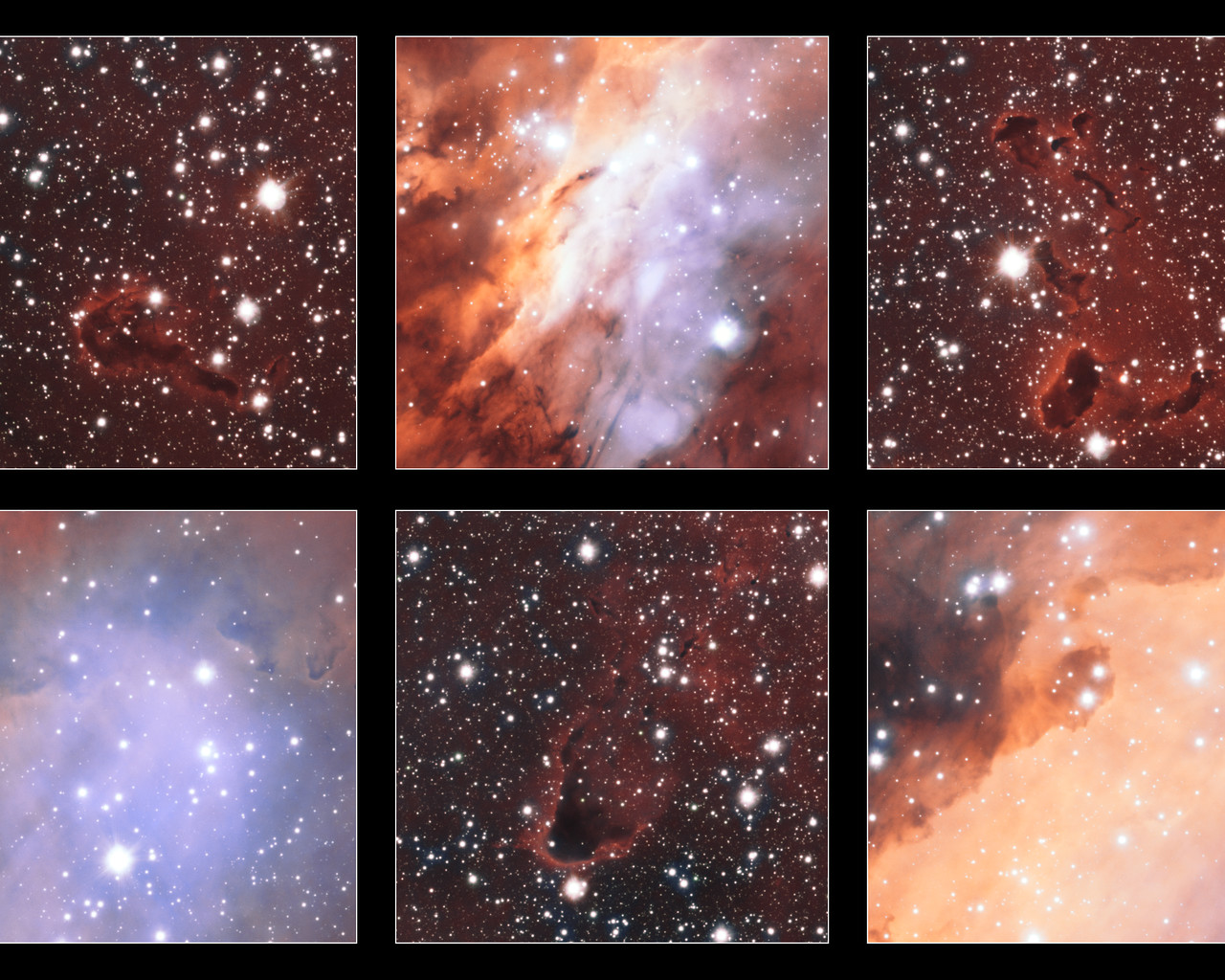 Cet ensemble de vignettes montre le détail de l'ensemble, pour le moins étrange et spectaculaire, de nuages de gaz brillants qui composent la vaste nurserie stellaire baptisée Nébuleuse de la Crevette. L'utilisation du Télescope de relevés du VLT installé à l'Observatoire de Paranal de l'ESO au Chili, a permis d'obtenir l'image la plus nette à ce jour de cet objet. Cette image contient également des informations obtenues grâce aux photographies de cet objet prises par Martin Pugh.