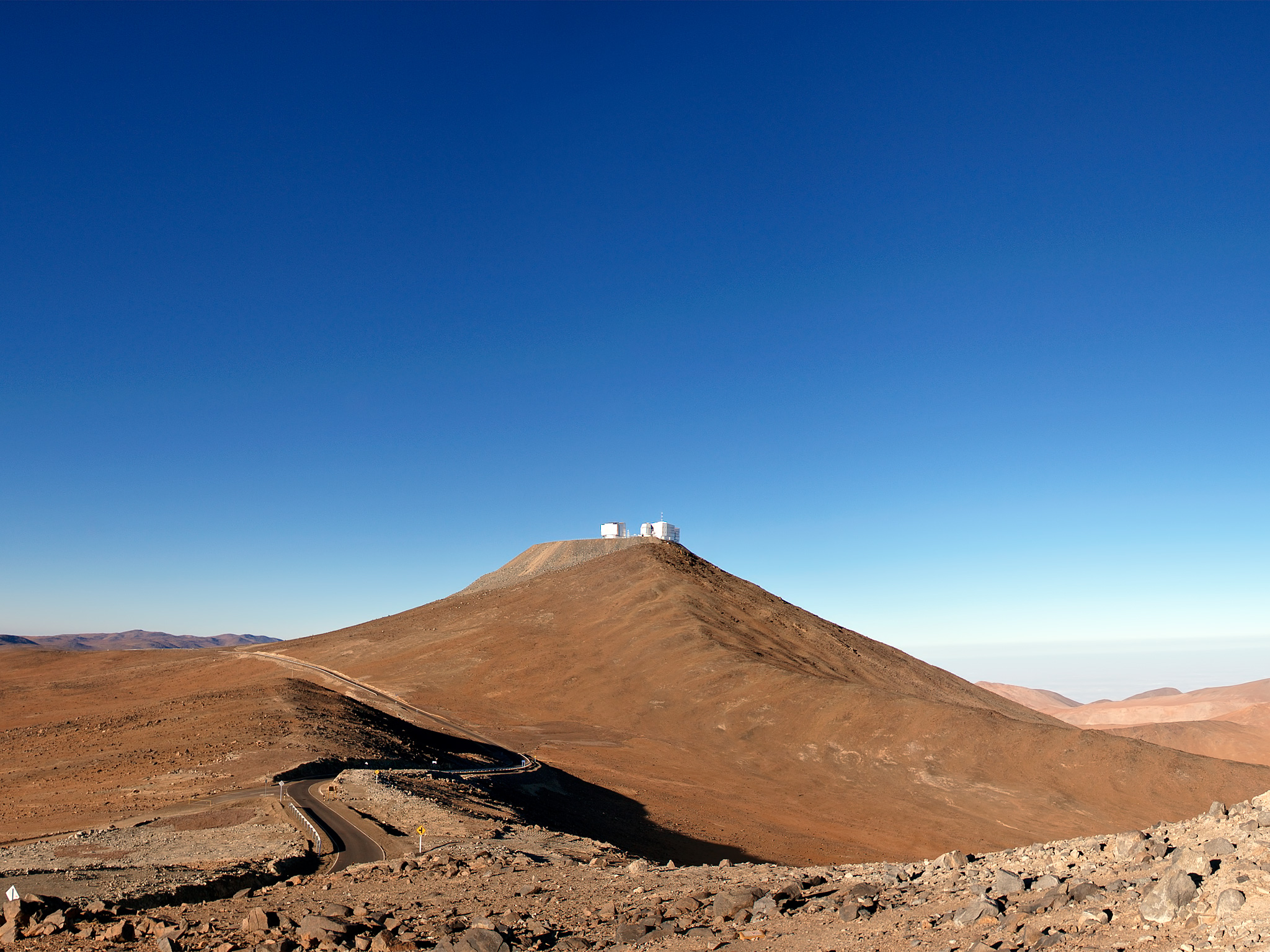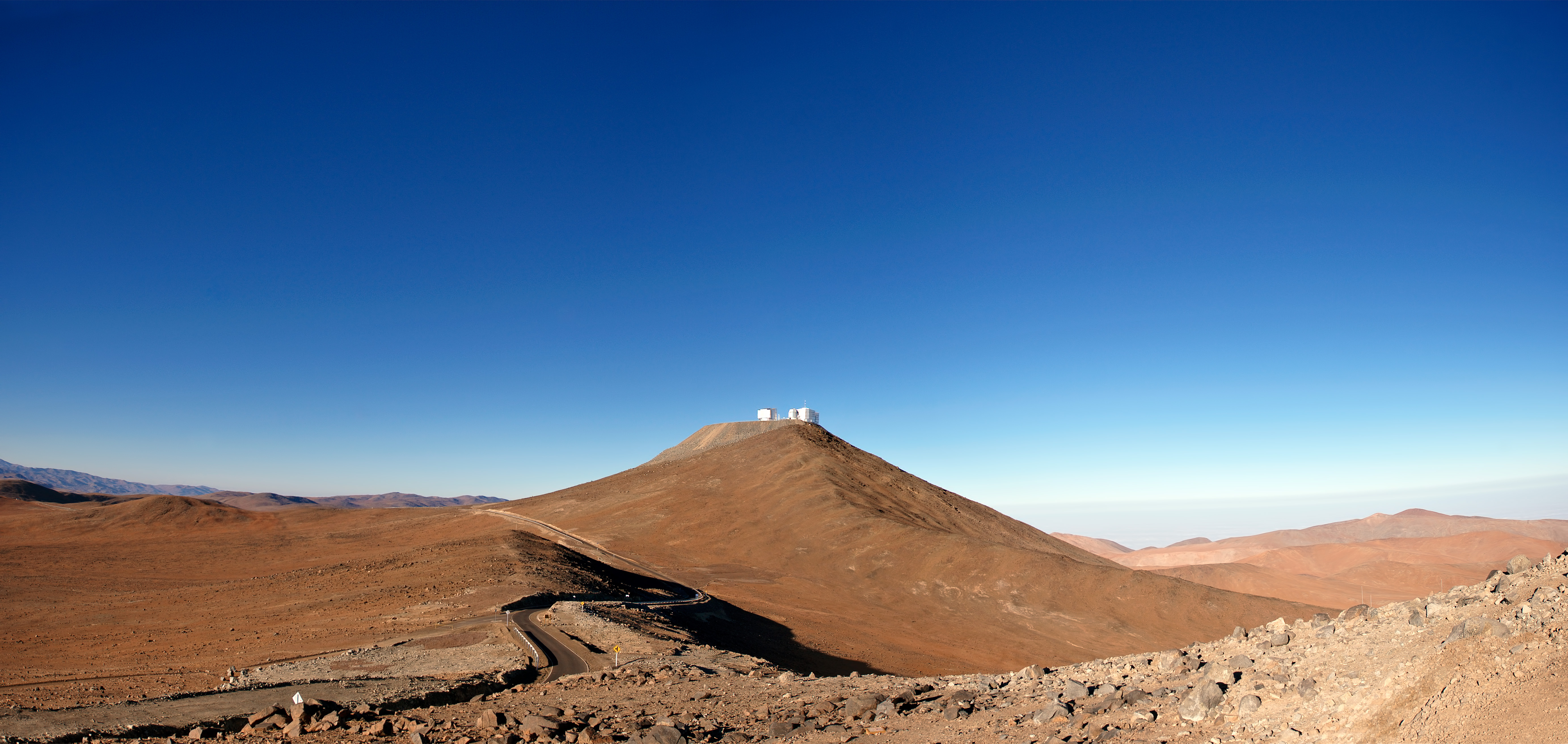 Cerro Paranal, culminant à 2600 mètres d'altitude se détache au centre de cette vue panoramique, pris en regardant vers le Sud. Ce sommet aplati est la demeure du VLT, l'installation de télescopes optiques et proches infrarouges terrestres le plus avancé au monde. Le VLT a quatre Unit Telescopes (UTs) de 8.2 mètres plus quatre Auxiliary Telescope (ATs) de 1.8 mètres. Dans cette image, seulement deux des coupoles des UTs avec le plus petit VLT Survey Telescope (VST) de 2.6 mètres sont visibles.