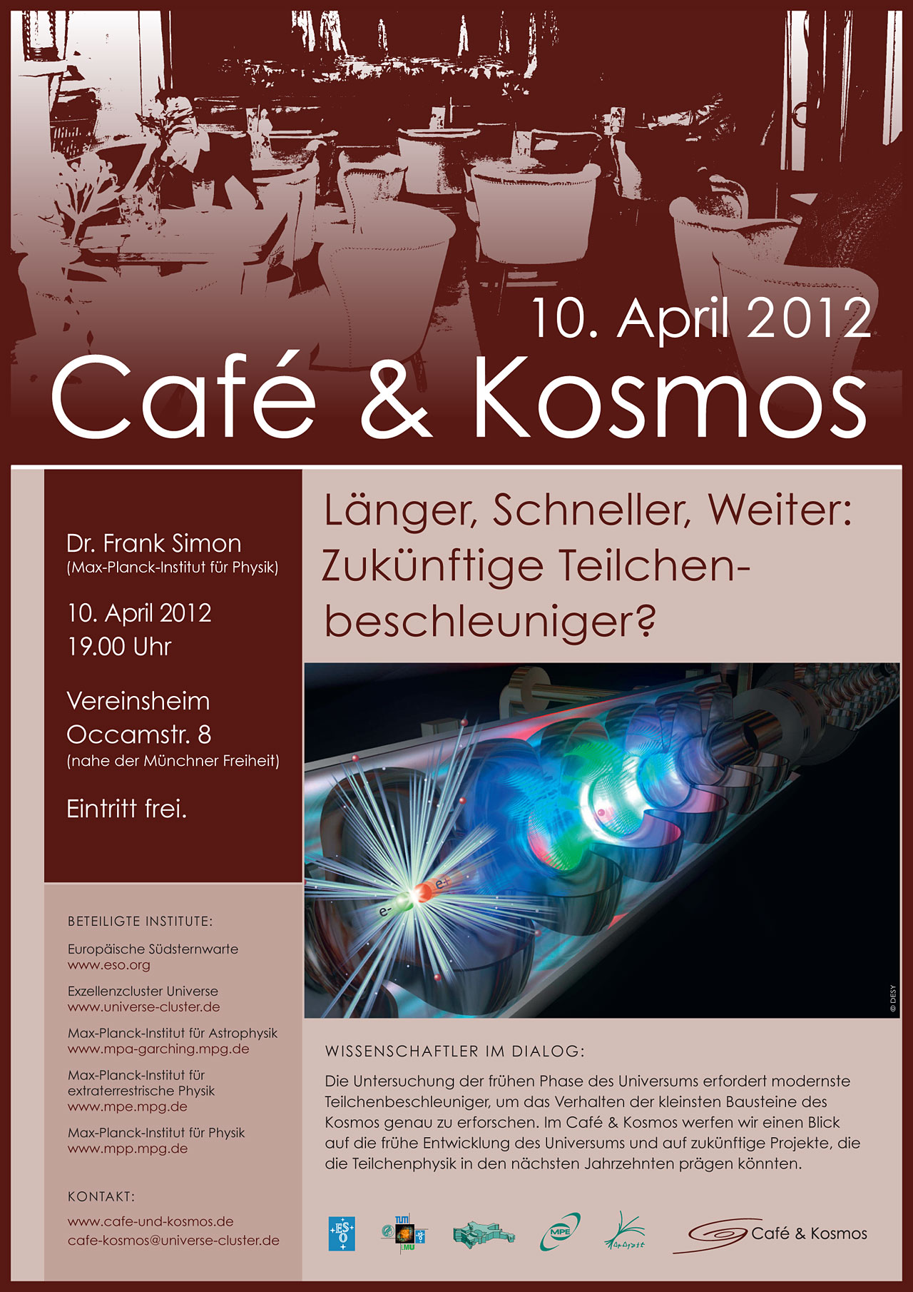 Am 10. April 2012 spricht Dr. Frank Simon vom Max-Planck-Institut für Physik über die Augenblicke kurz nach dem Urknall, in denen das Universum mit elementaren Teilchen gefüllt war. Um diesen Zeitabschnitt des Kosmos noch besser zu verstehen, sind neue noch umfangreichere Messinstrumente notwendig. Zukünftige globale Teilchenbeschleunigerprojekte wie der International Linear Collider (ILC) oder der Compact Linear Collider (CLIC) sollen als riesige "Teilchenbeschleuniger-Mikroskope" tief in die Vergangenheit des Universums hineinschauen