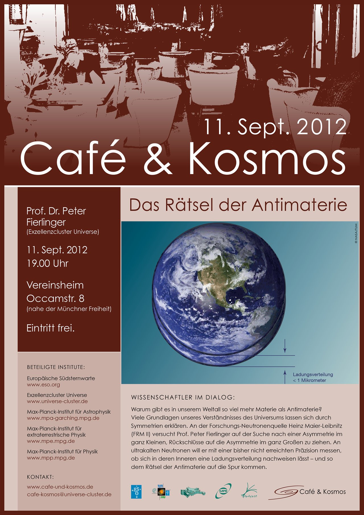 Im Café & Kosmos am 11. September 2012 diskutiert Professor Peter Fierlinger vom Exzellenzcluster Universe mit den Besuchern, warum die Antimaterie bisher ein Rätsel darstellt und wie die Entdeckung eines elektrischen Dipolmoments des Neutrons zur Lösung dieses Rätsels beitragen würde.