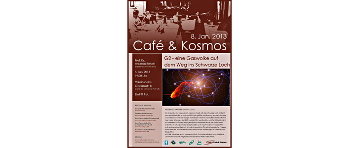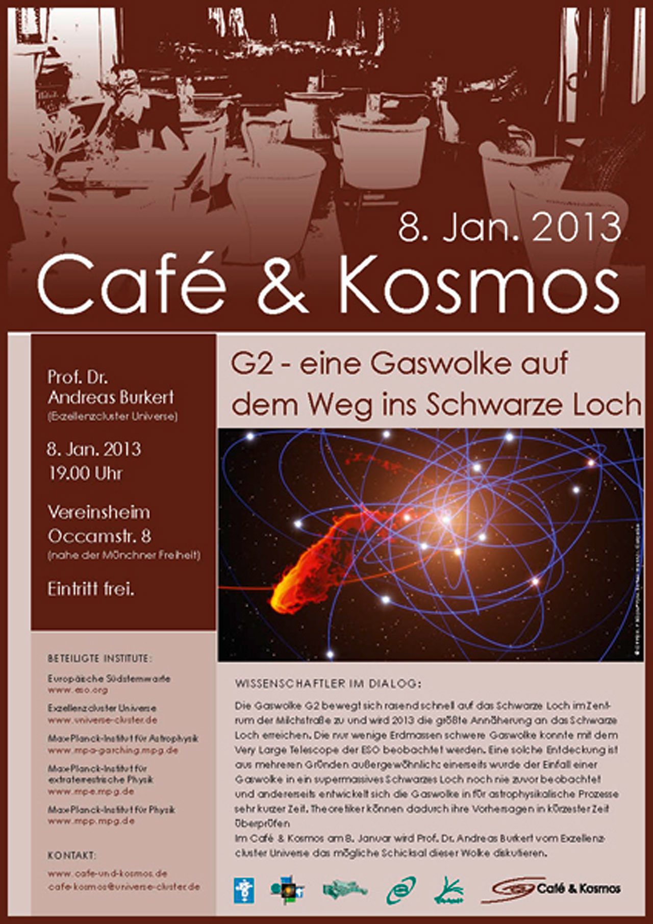 Eine solche Entdeckung ist aus mehreren Gründen außergewöhnlich: Einerseits wurde der Einfall einer Gaswolke in ein supermassives Schwarzes Loch noch nie zuvor beobachtet und andererseits entwickelt sich die Gaswolke in für astrophysikalische Prozesse sehr kurzer Zeit. Theoretiker können dadurch ihre Vorhersagen in kürzester Zeit überprüfen. Im Café & Kosmos am 8. Januar 2013 wird Prof. Dr. Andreas Burkert vom Exzellenzcluster Universe das mögliche Schicksal dieser Wolke diskutieren.