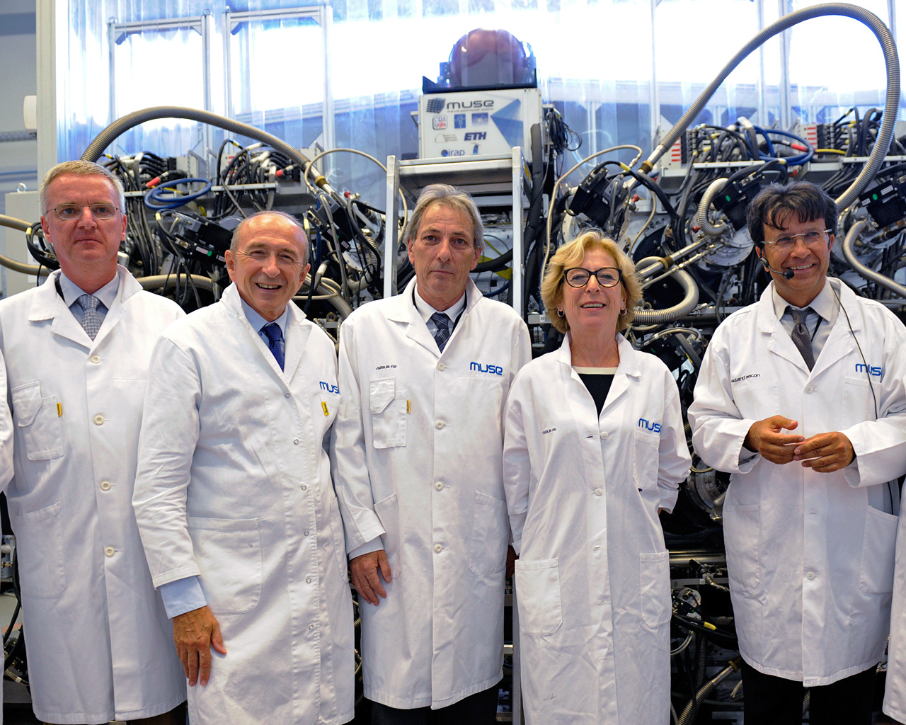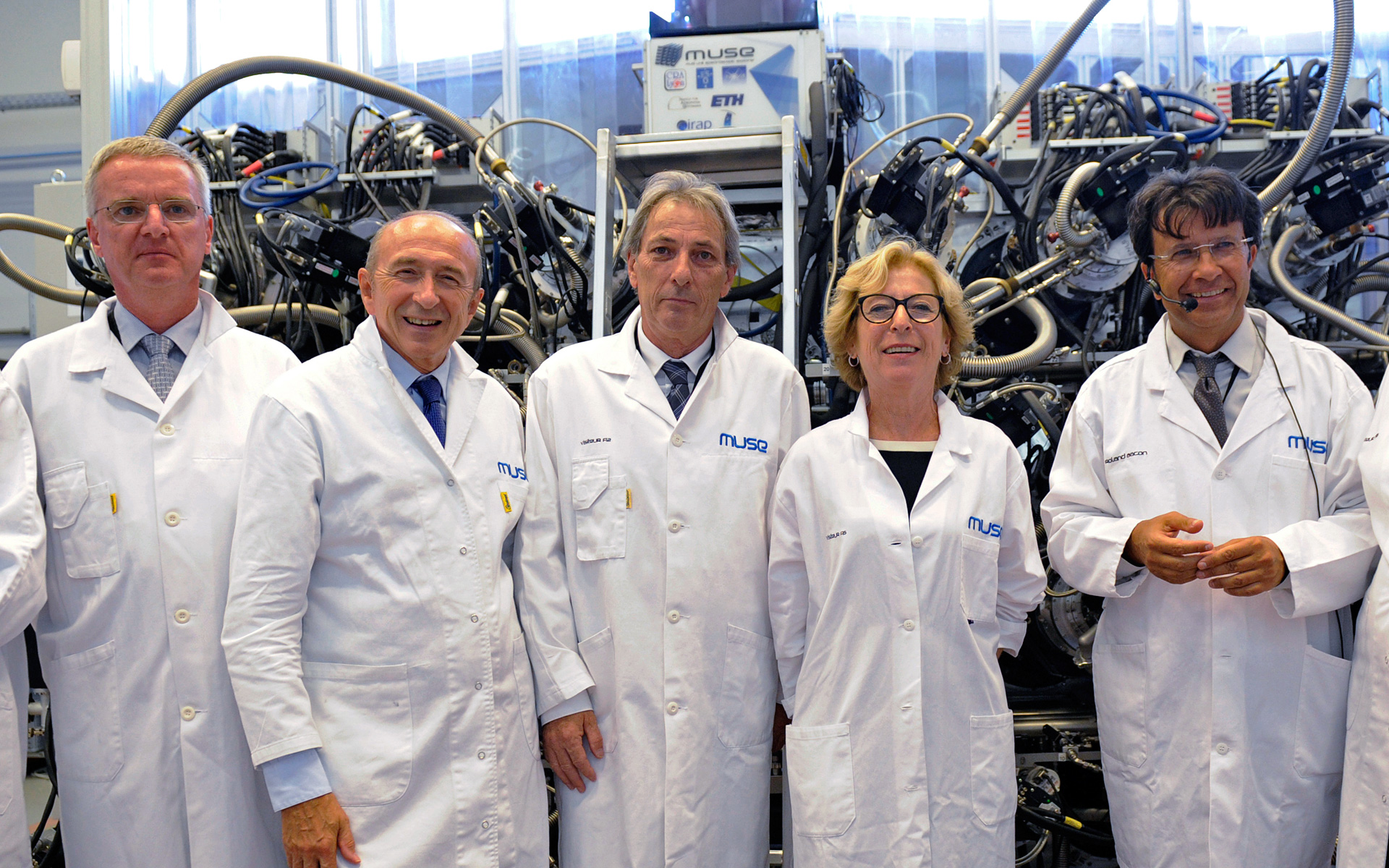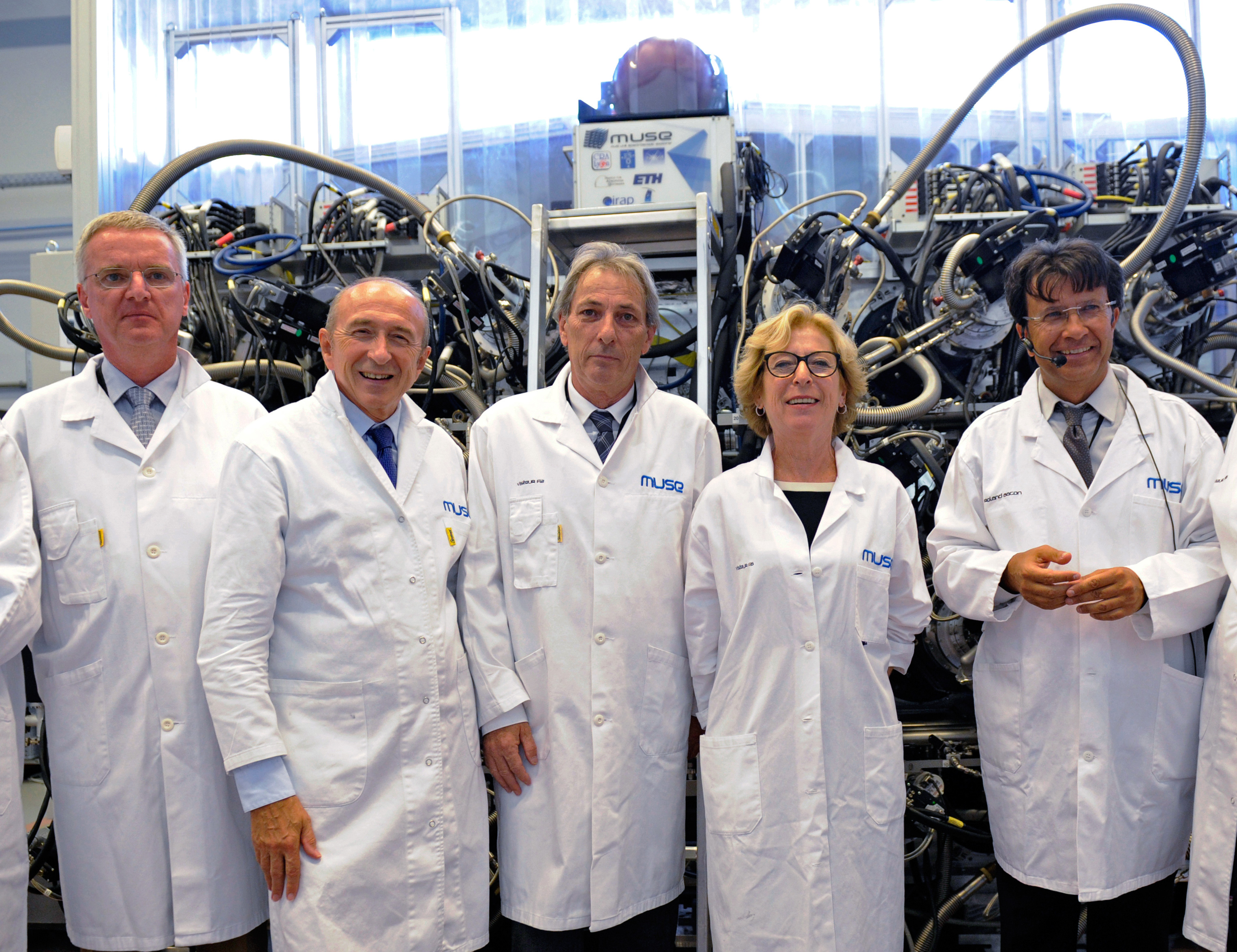Dieses Foto zeigt von links nach rechts: Tim de Zeeuw (Generaldirektor der ESO), Gérard Collomb (Bürgermeister von Lyon), François-Noël Gilly (Universitätspräsident von Claude Bernard Lyon ), Geneviève Fioraso (Ministerin für Hochschulbildung und Forschung) und Roland Bacon (Hauptentwickler von MUSE).