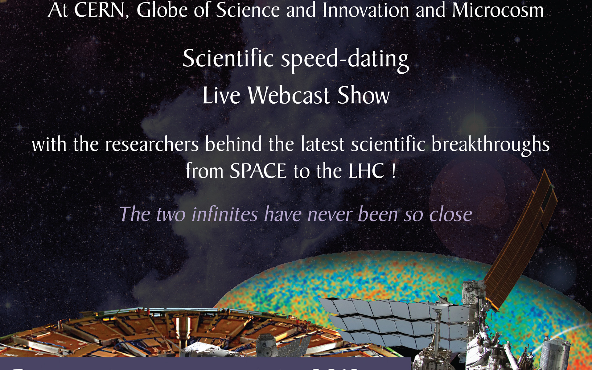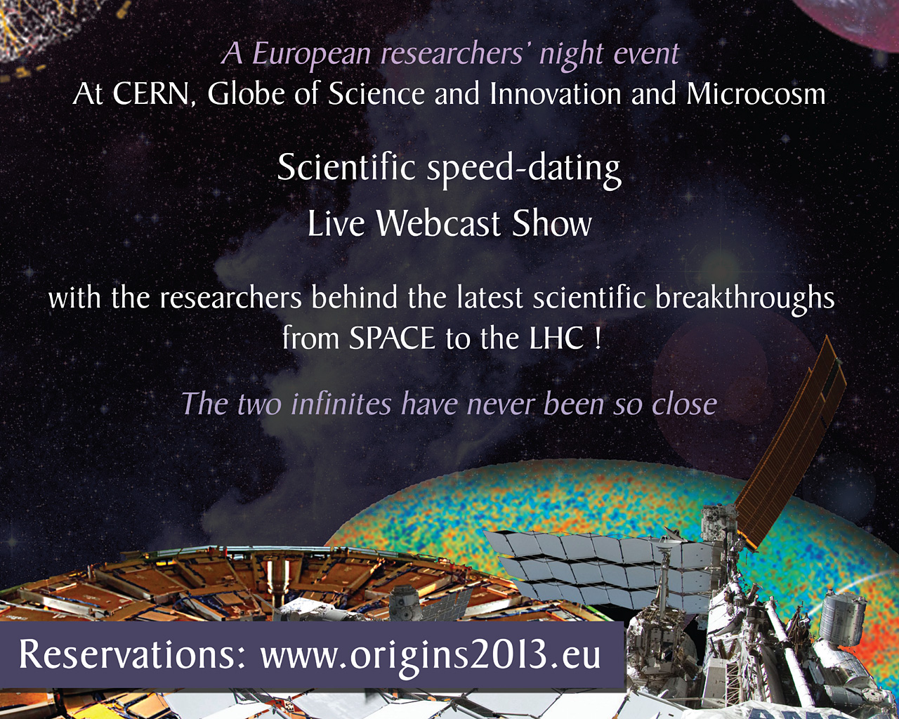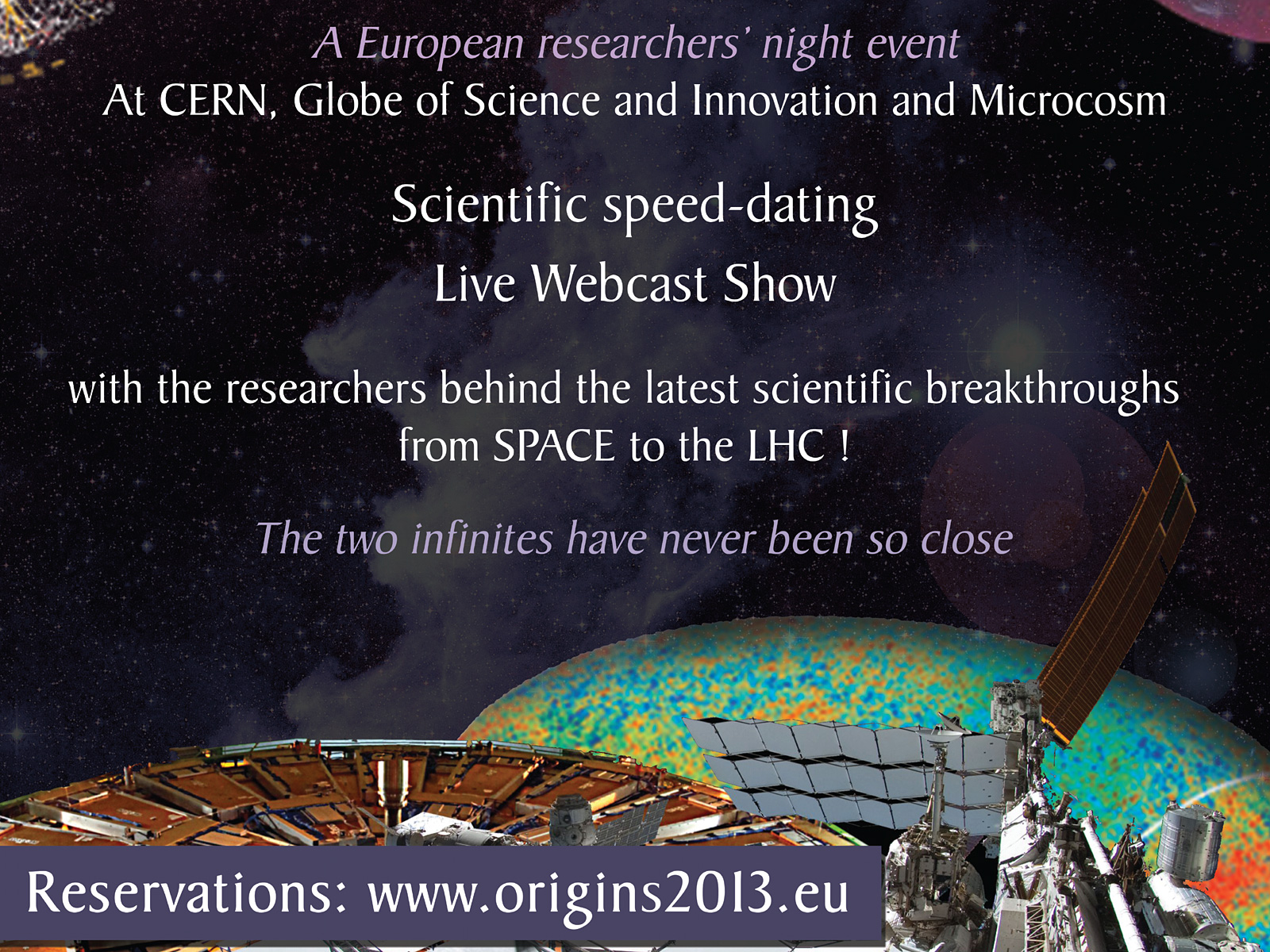 Dieses Poster wirbt für ein einzigartiges Event, das Origins 2013 genannt wird und vom CERN, von der ESA, der ESO und der UNESCO in Zusammenarbeit mit dem italienischen Institut für Astrophysik (INAF) in Genf, Paris und Bologna am 27. September 2013 – der europäischen Nacht der Forscher – organisiert wird. Menschen in aller Welt können das Event live durch Webcasts verfolgen.