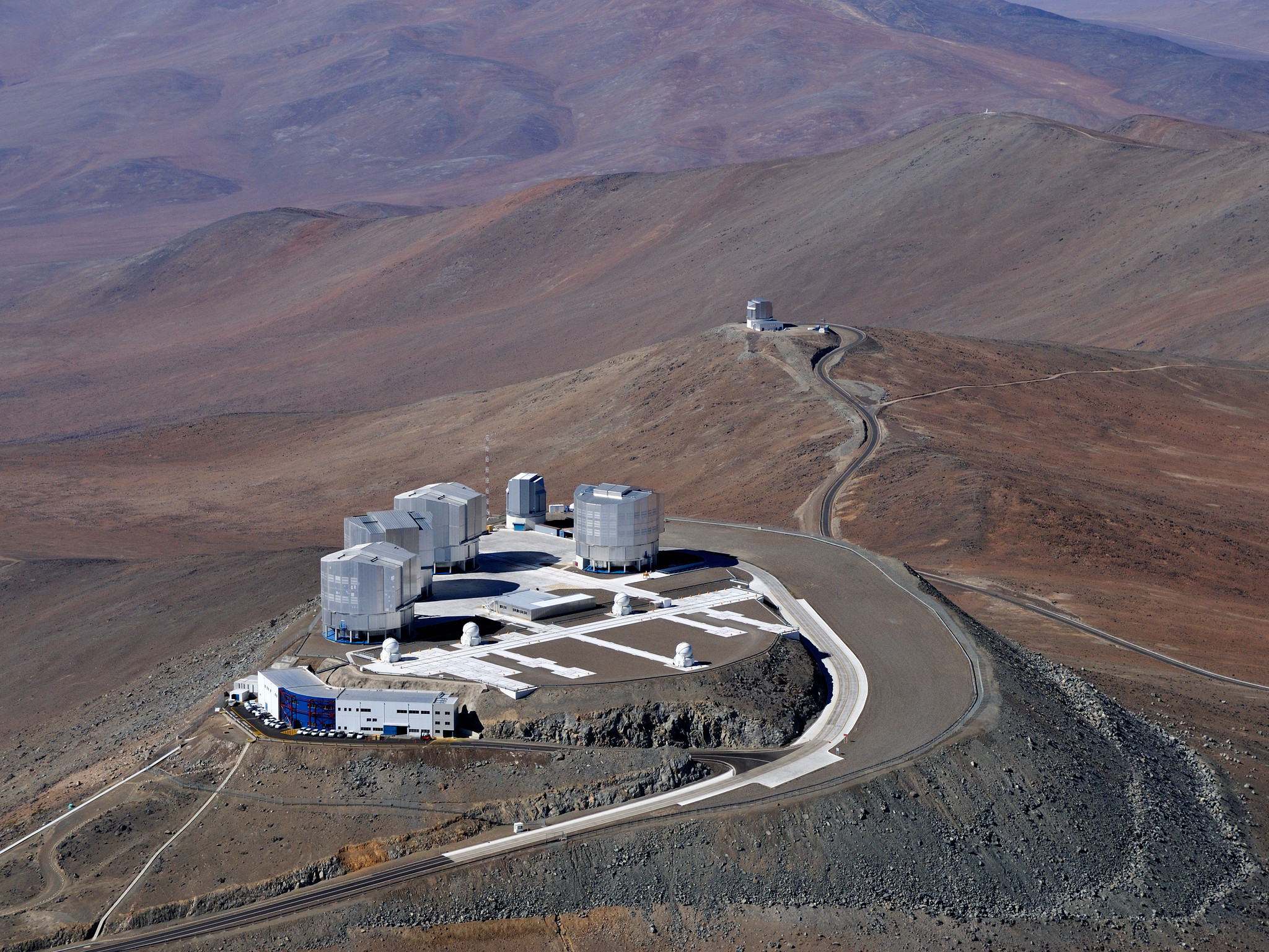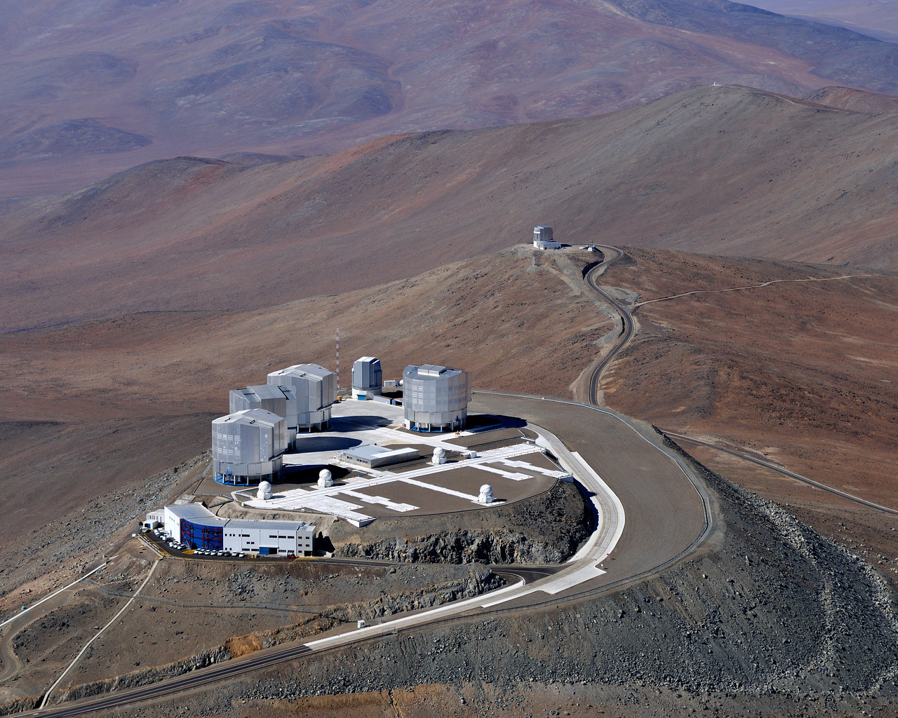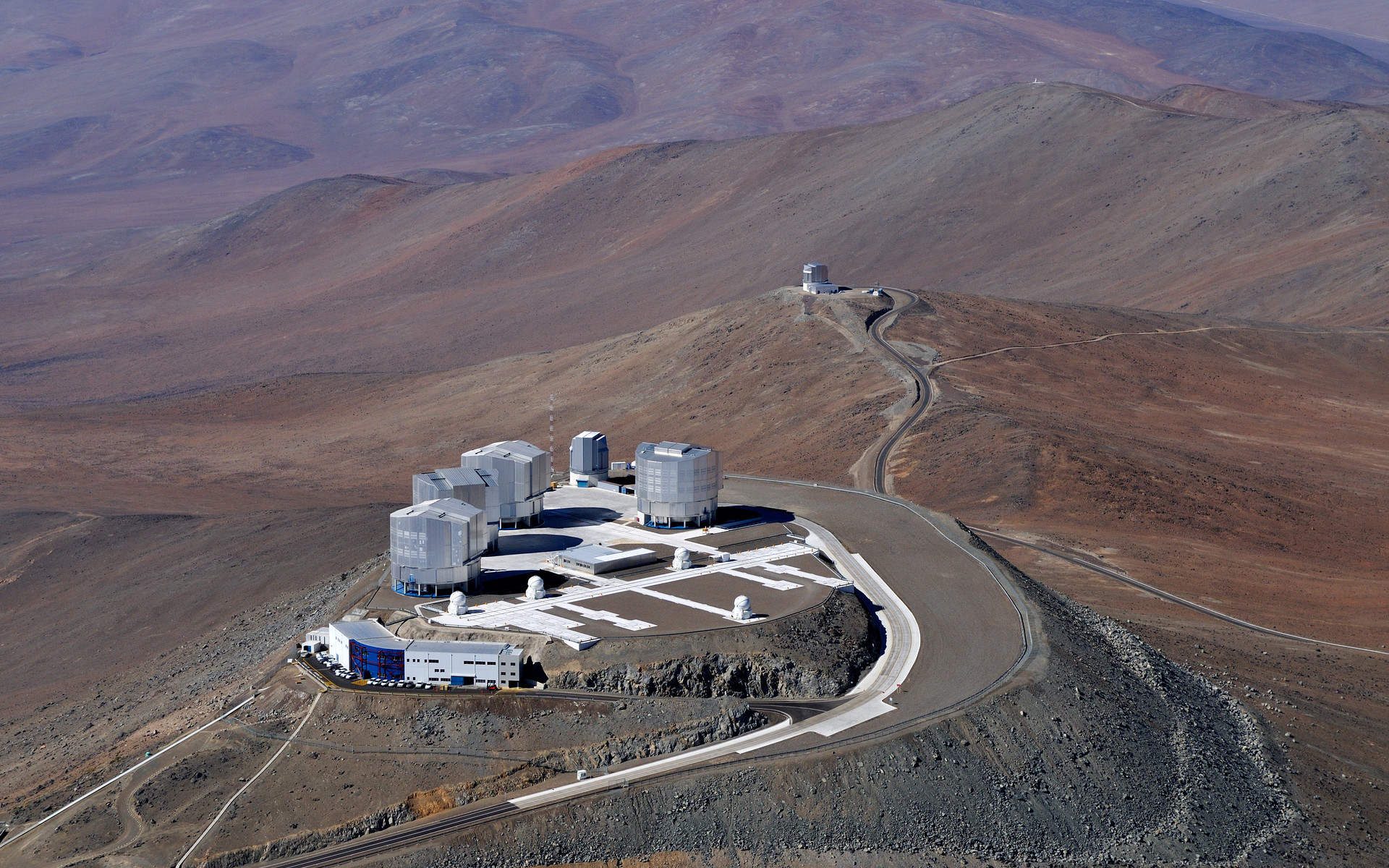 Ein Vogel, der hoch in der Luft über der abgelegenen, dünn besiedelten Atacamawüste im Norden Chiles segelt - vermutlich die trockenste Wüste der Erde - wäre vermutlich überrascht angesichts der hoch technisierten Oase des Very Large Telescope (VLT) der ESO auf dem Paranal. das weltweit fortschrittlichste bodengebundene astronomische Observatorium der Welt wird hier betrieben, mit vier 8,2-Meter-hauptteleskopen, vier 1,8-Meter-Hilfsteleskopen, dem VLT Survey Telescope (VST) und dem 4,1-Meter Visible and Infrared Survey Telescope for Astronomy (VISTA), das man im Hintergrund über der Beobachtungsplattform auf dem benachbarten Berggipfel sehen kann.