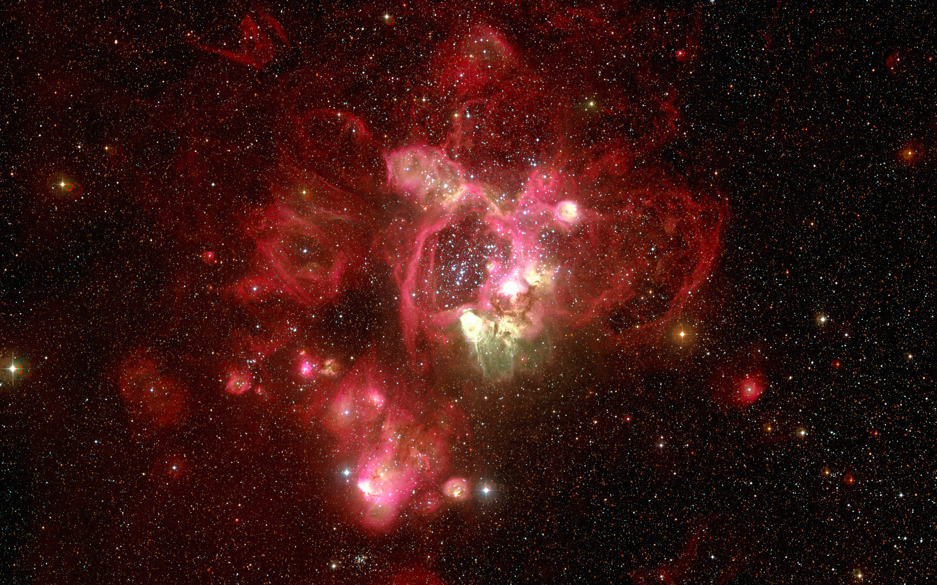 Südlicher Teil der eindrucksvollen H II-Region N44 in der Großen Magellanschen Wolke. Grüne Färbung deutet darauf hin, dass entsprechende Bereiche besonders heiß sind. Das Gesichtsfeld der Aufnahme beträgt 27,5 x 26,5 Bogenminuten, Norden ist oben und Osten ist links.