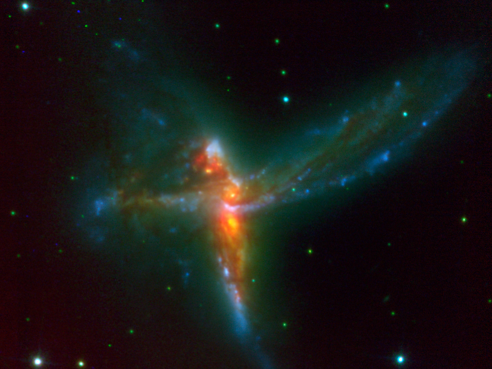 In dieser Falschfarbendarstellung wurden eine 30 lang belichtete Aufnahme im K-Band von dem NACO-Instrument mit Archivdaten vom Hubble-Weltraumteleskop mit der Kamera ACS in den Bändern B und I kombiniert. das Ergebnis ist ein Farbbild des vogelähnlichen Galaxiensystems. Mithilfe der NACO-Daten konnten die Astronomen nicht nur die beiden schon zuvor bekannten Spiralgalaxien beobachten, sondern auch die dritte, unabhänige Komponente identifizieren: eine irreguläre, aber vergleichsweise massereiche Galaxie, in der sich besonders viele Sterne bilden.