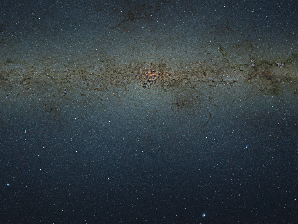 Diese atemberaubende Aufnahme der zentralen Bereiche unserer Milchstraße wurde mit dem VISTA-Durchmusterungsteleskop am Paranal-Observatorium der ESO in Chile gewonnen. Das riesige Bild besteht aus 108.200 x 81.500 Pixeln, insgesamt also über 9 Milliarden Pixeln. Es wurde aus tausenden Einzelbelichtungen, die mit VISTA durch drei verschiedene Nahinfrarotfilter aufgenommen wurden, zu einem gewaltigen Mosaik zusammengesetzt. Die zugrundeliegenden Daten sind Teil der öffentlich zugänglichen VVV-Durchmusterung, mit der im Zentralbereich der Milchstraße so viele Sterne wie nie zuvor untersucht werden. Da die VISTA-Kamera für infrarotes Licht empfindlich ist, kann sie einen Blick durch den für Beobachtungen mit sichtbarem Licht weitgehend undurchsichtigen Staubschleier werfen, der das Zentrum der Milchstraße verbirgt. Auch in der VISTA-Aufnahme sind allerdings noch etliche undurchsichtige Staubfilamente zu sehen.