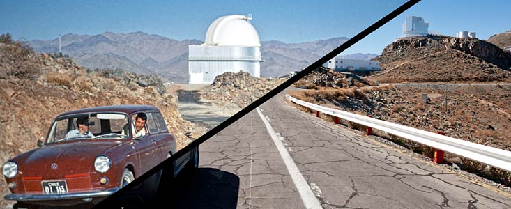 Hier sieht man zwei Aufnahmen von La Silla vom Juni 1968 und aus der heutigen Zeit, die in der Nähe der beiden Wassertanks des Observatoriums aufgenommen wurden und den Rest der Anlage zeigen. Die Veränderungen kann man leicht sichtbar machen, wenn man mit der Maus die Trennlinie im Bild verschiebt.