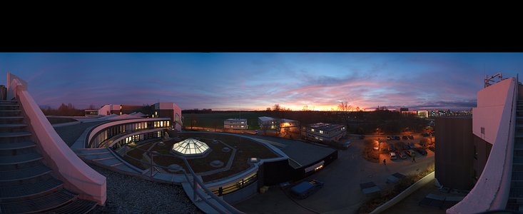 Diese Panoramaaufnahme zeigt den Hauptsitz der Europäischen Südsternwarte in Garching bei München. Das Bild zeigt den Blick vom Dach des Hauptgebäudes kurz nach Sonnenuntergang. Der Hauptsitz ist das wissenschaftliche, technische und administrative Zentrum für die Arbeitsabläufe der ESO und die Basis für viele Astronomen, die hier ihre Forschungsarbeiten durchführen. Die Wissenschaftler, Techniker und das Mitglieder des Verwaltungspersonals, die hier arbeiten, haben sehr unterschiedliche Hintergründe, aber alle verbindet eine Gemeinsamkeit: ihre Passion für die Astronomie.