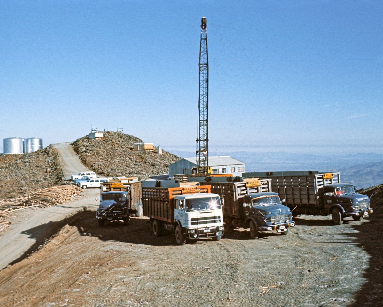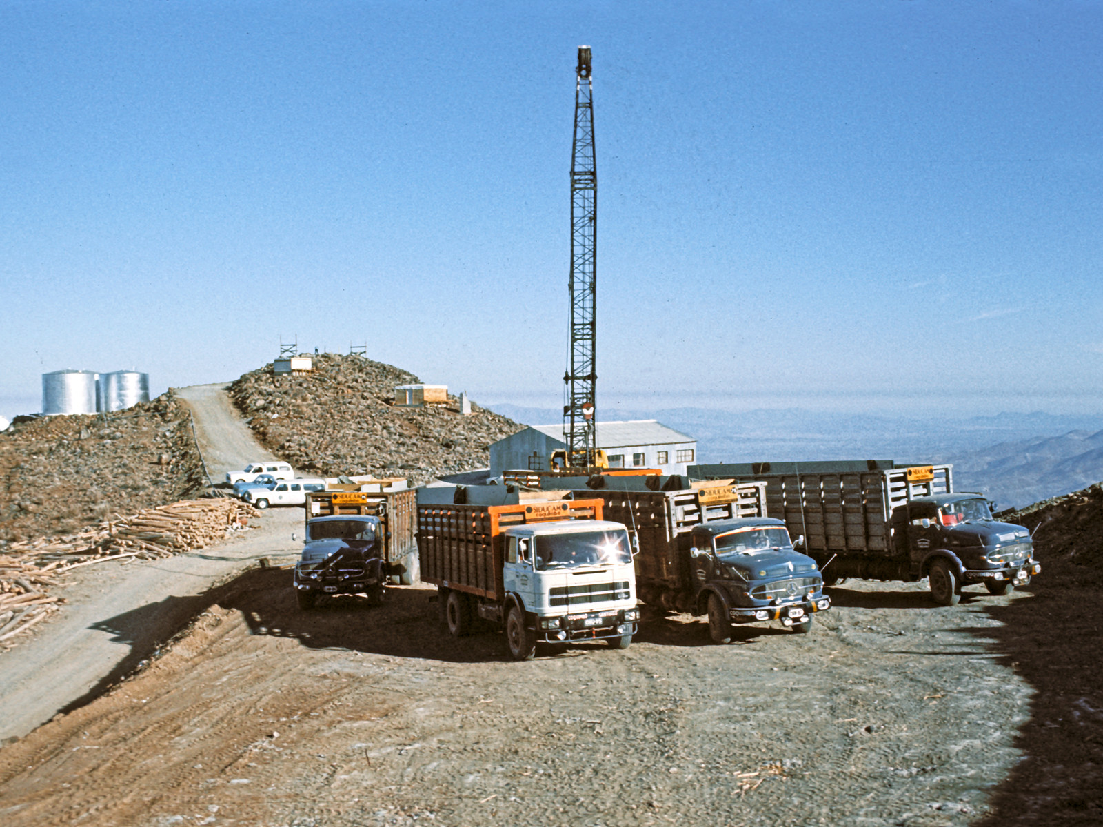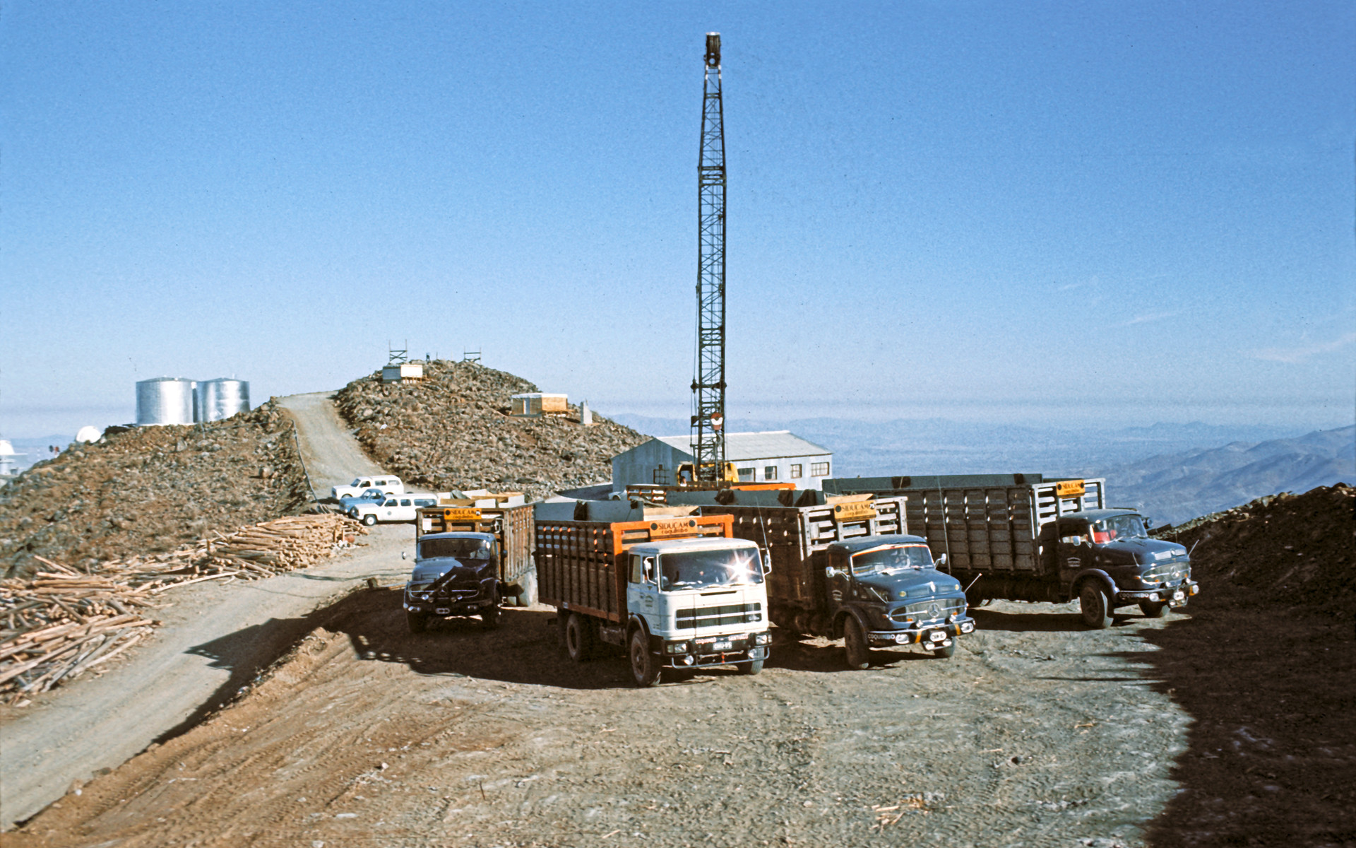 Dieses Foto aus dem Jahr 1975 zeigt einige Lastwagen und andere Ausrüstungsgegenstände, die zum Bau der Kuppel des 3,6-Meter-Teleskopes der ESO benötigt wurden, das hinter dem Fotografen am Entstehen ist. Auf der linken Seite liegen die Wassertanks der Anlage.